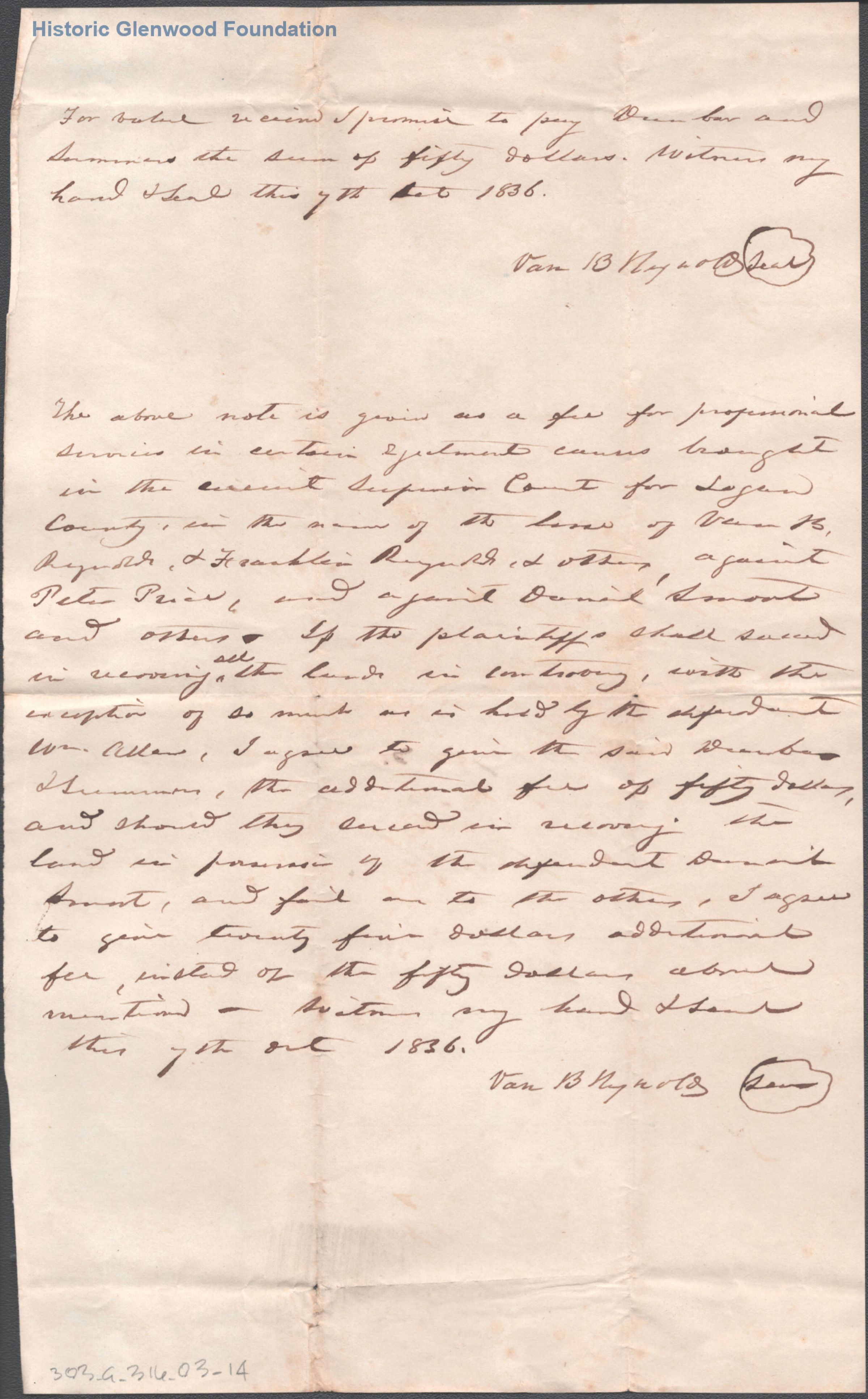 Engagement of Judge George Summers & Matthew Dunbar for legal services for Van Reynolds, October 7, 1836Entry/Object ID