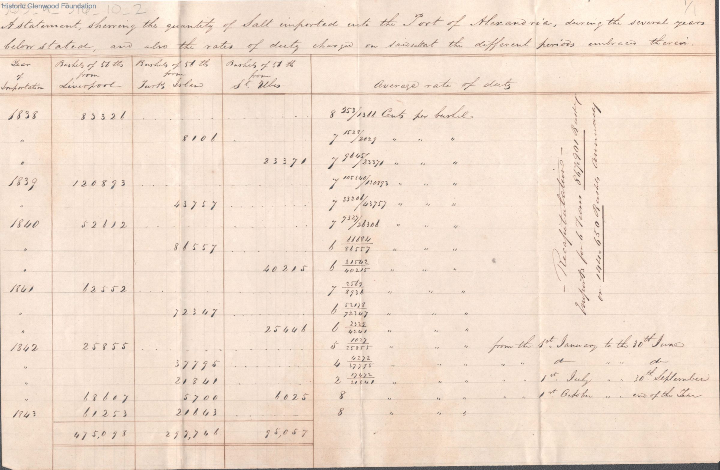 Single page report of salt imports to Judge George Summers from A. W. Quarrier, c. 1844.