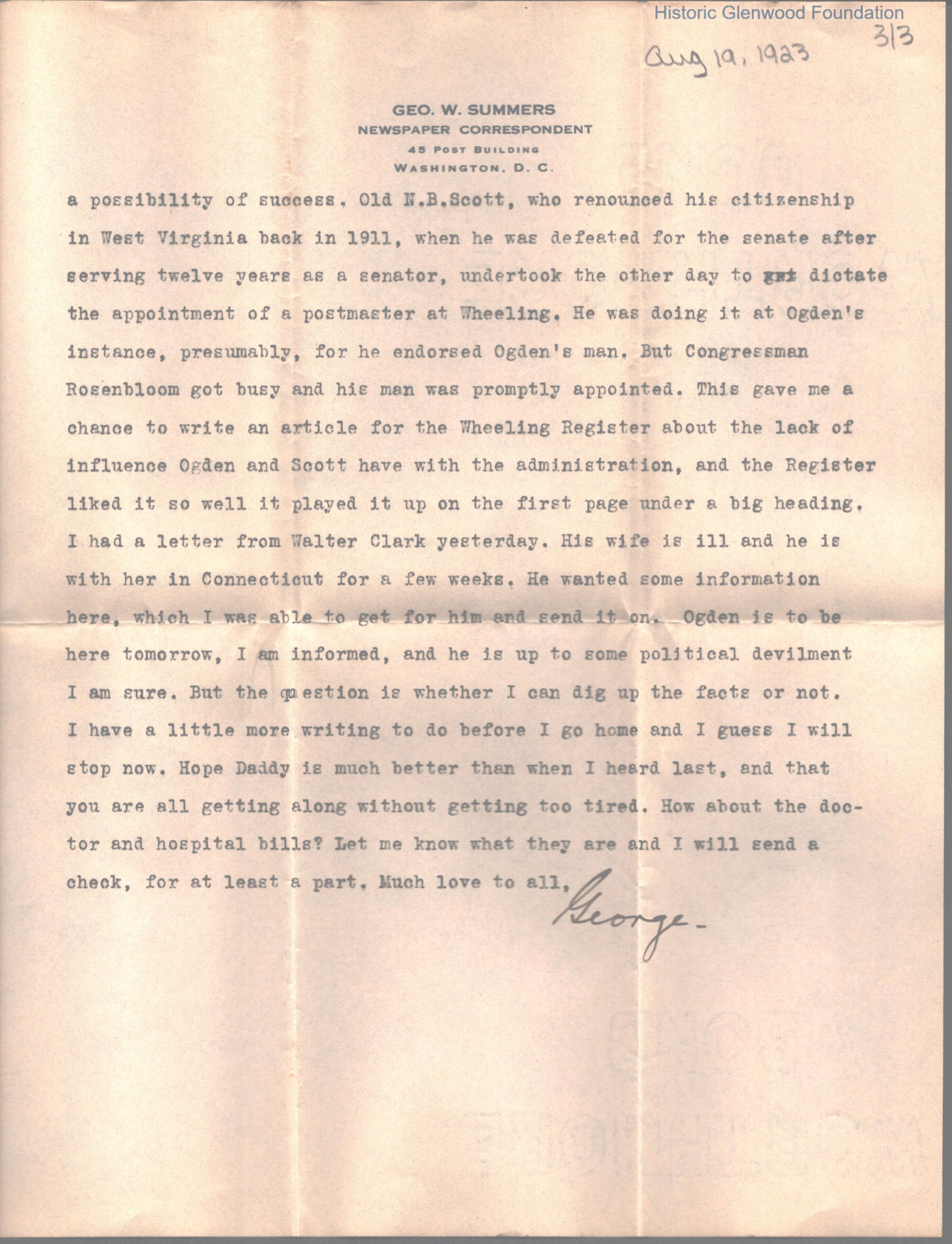 Lucy W. Summers from George W. Summers, August 19, 1923Entry/Object ID