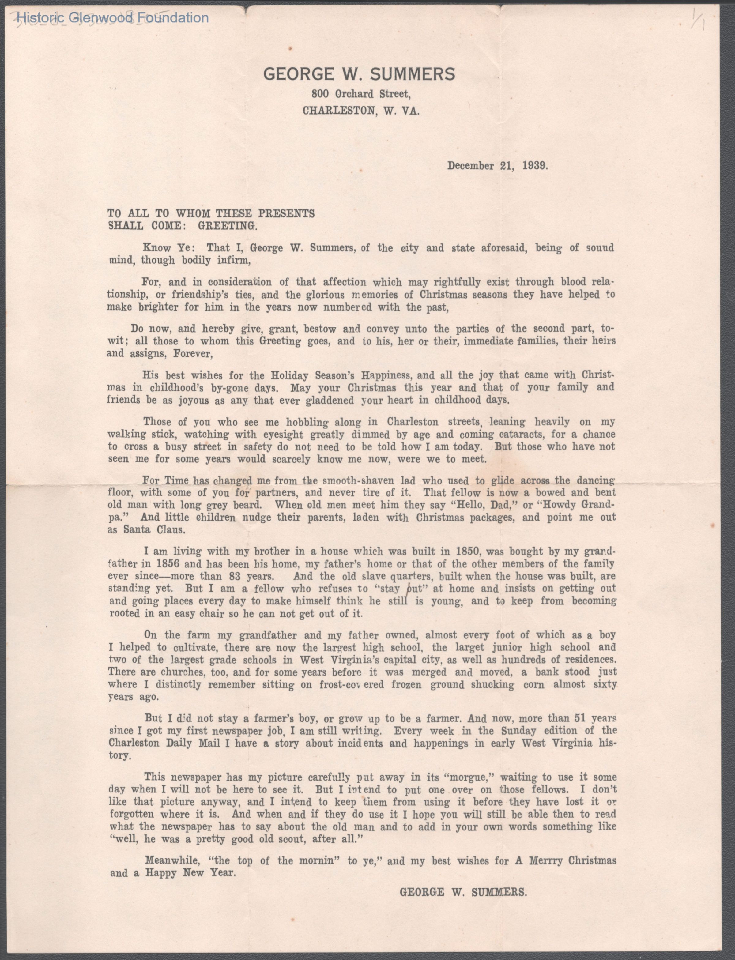 Single-page George W. Summers Christmas greeting, Dec 21, 1939.