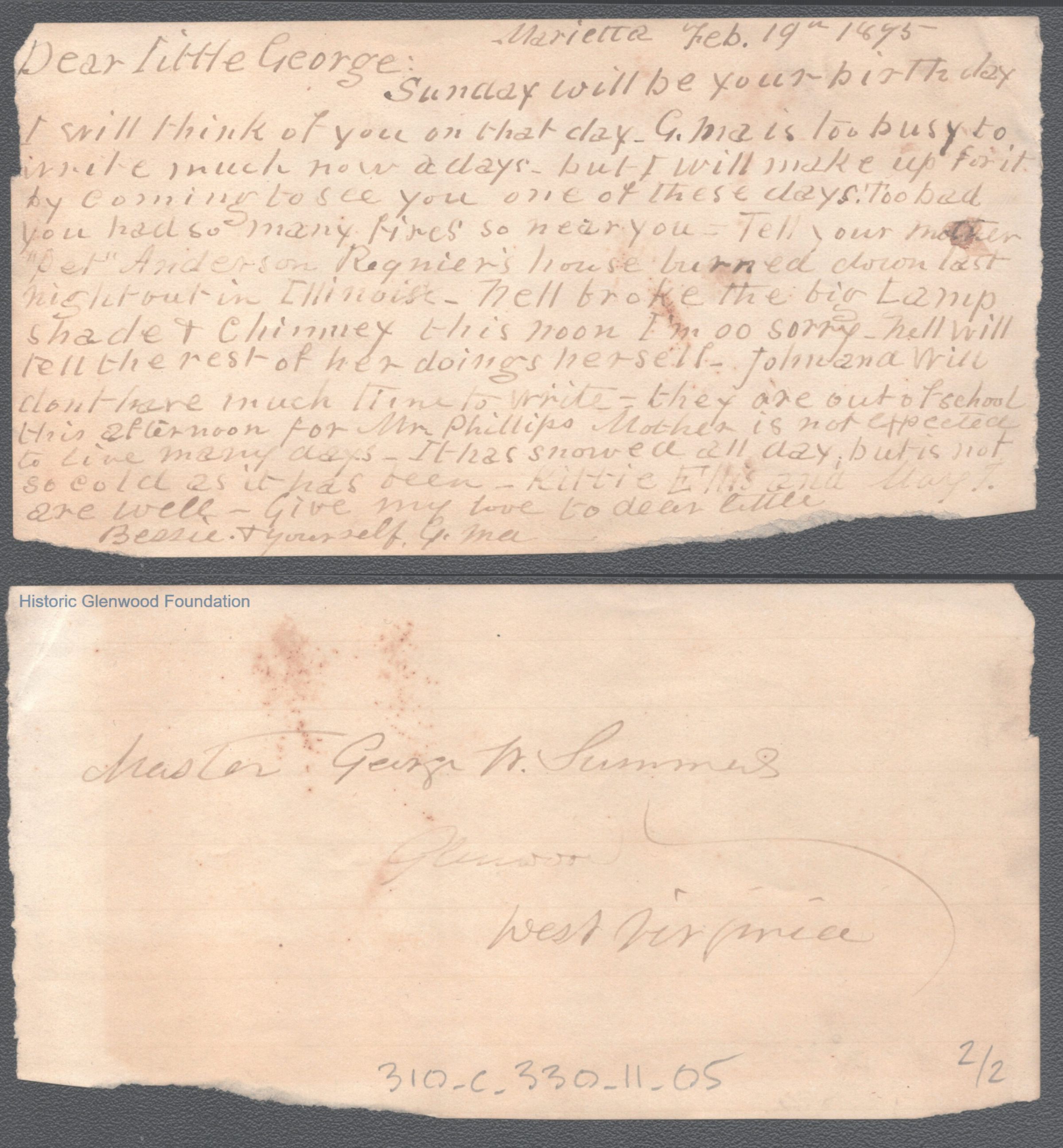 Single page letter to George W. Summers from his grandmother Abigail E. Woodbridge, Feb 19, 1875.