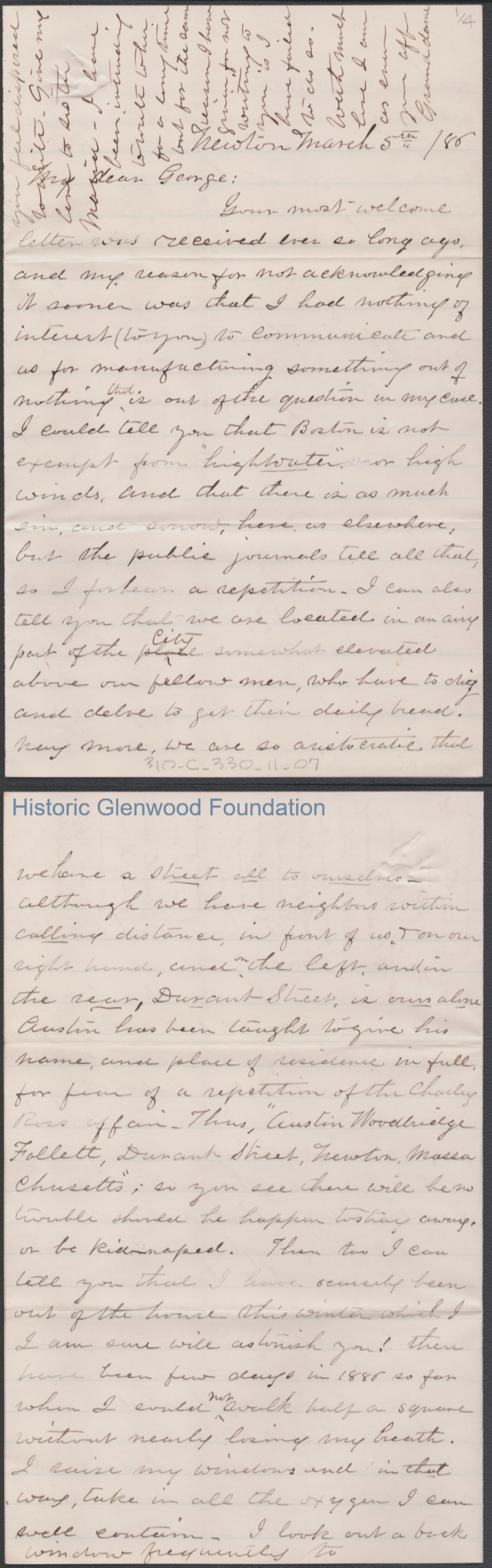 Four-page letter to George W. Summers from his grandmother Abigail E. Woodbridge, Mar 5, 1886.