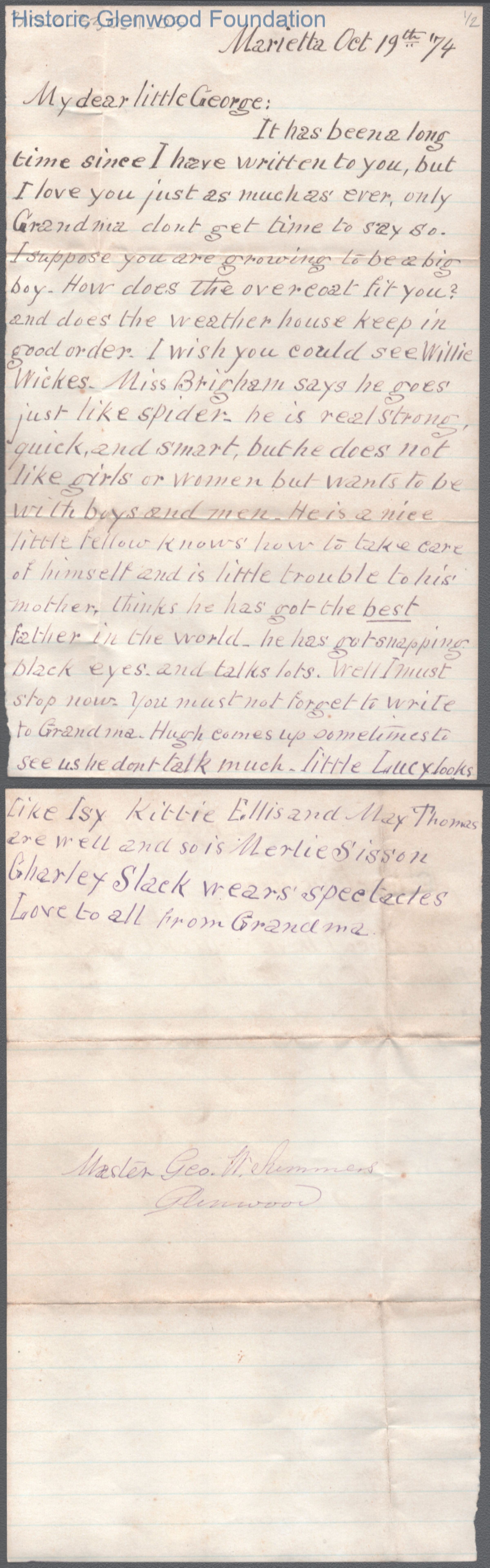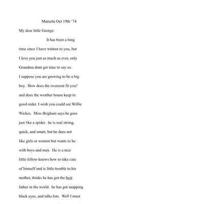 Two-page letter to George W. Summers from his grandmother Abigail E. Woodbridge, Oct 19, 1874.