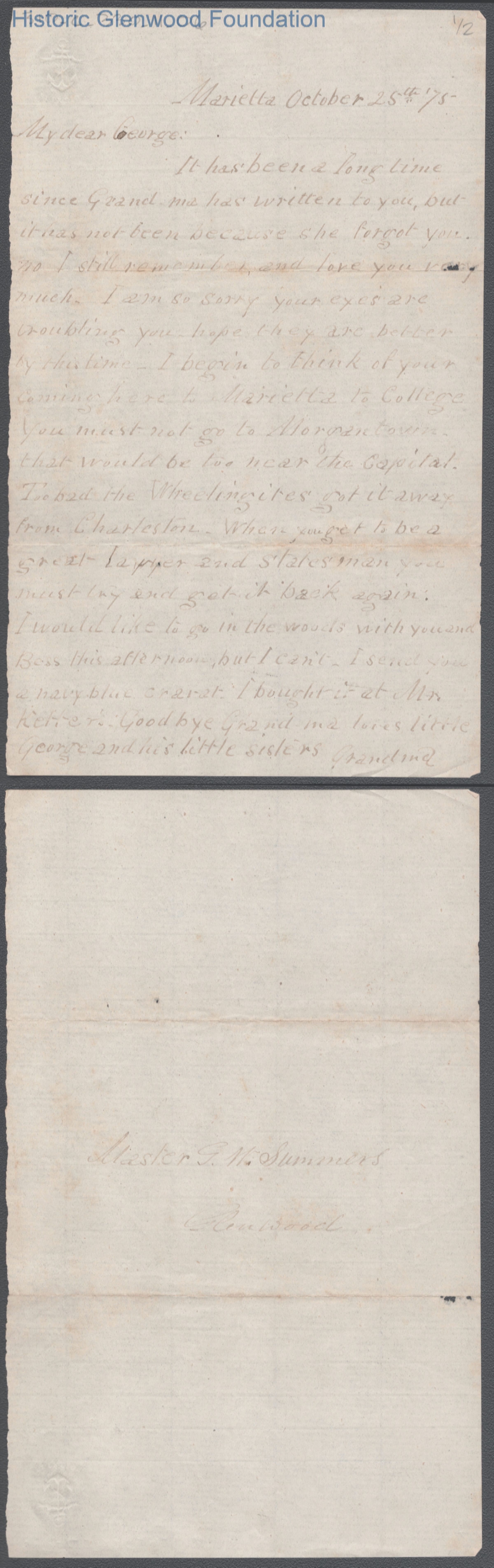 Single page letter to George W. Summers from his grandmother Abigail E. Woodbridge, Oct 25, 1875.