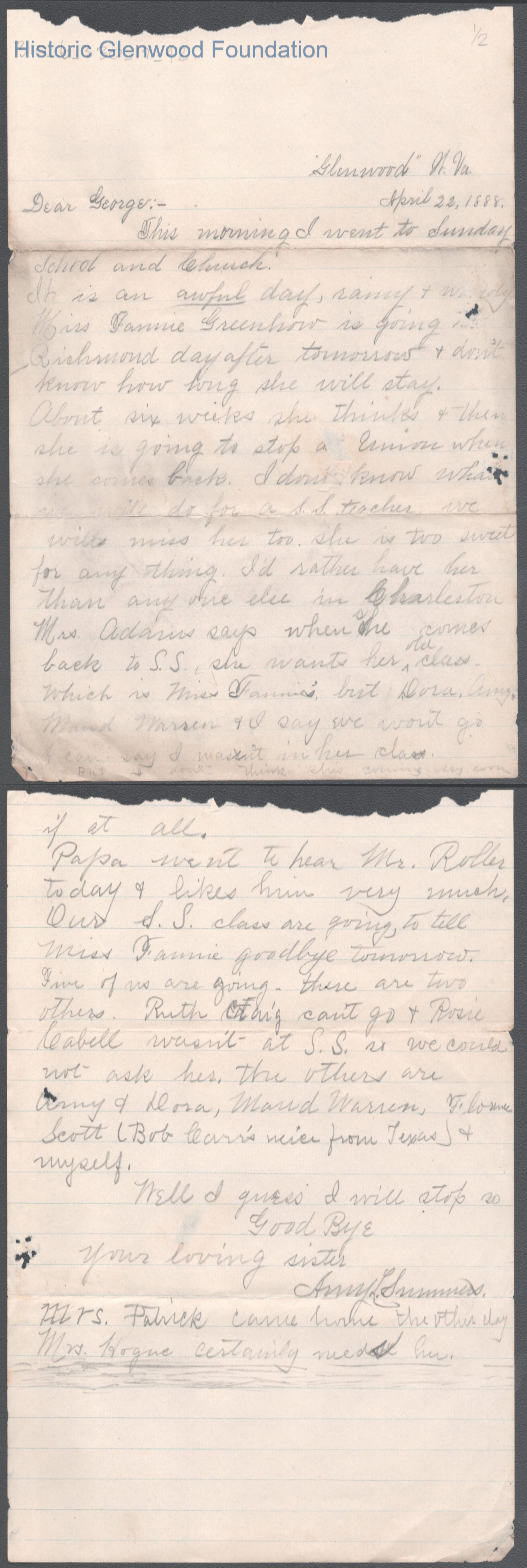 Two-page letter to George W. Summers from his sister Amacetta Summers, Apr 22, 1888.