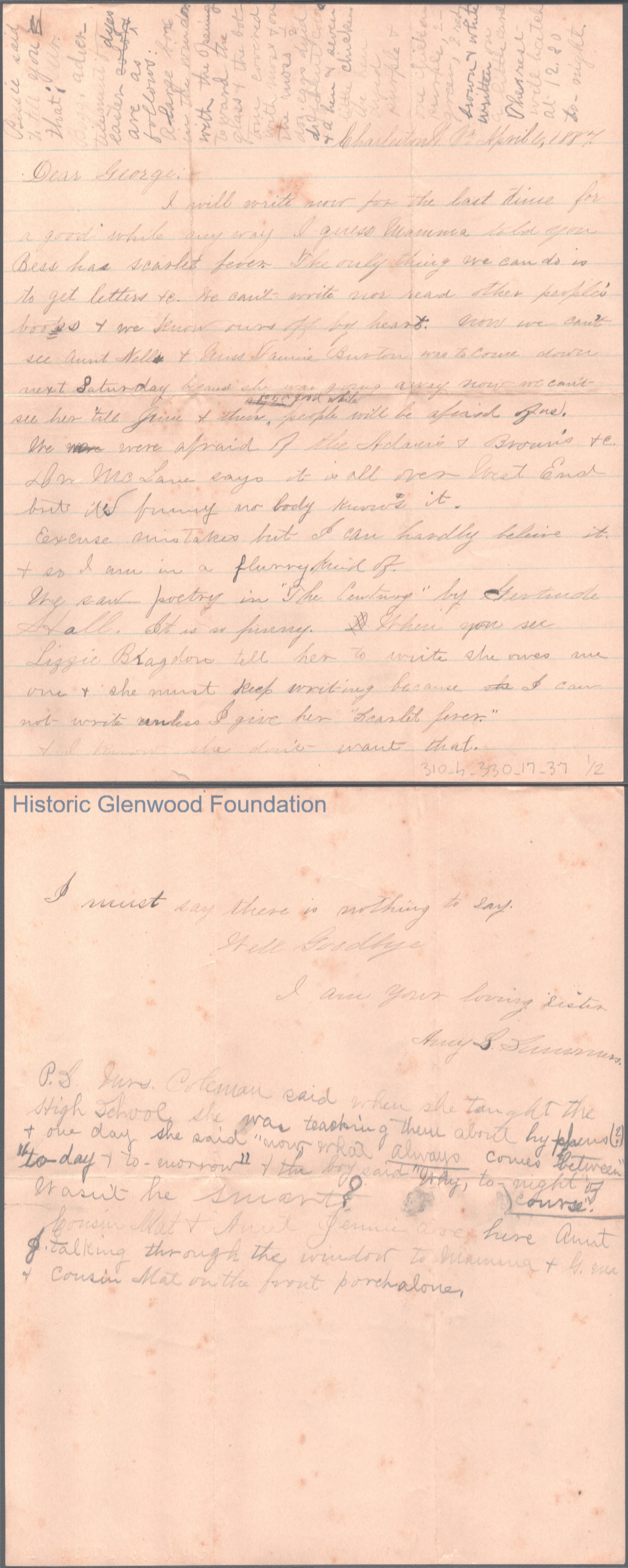 Two-page letter to George W. Summers from his sister Amacetta Summers, Apr 6, 1887.