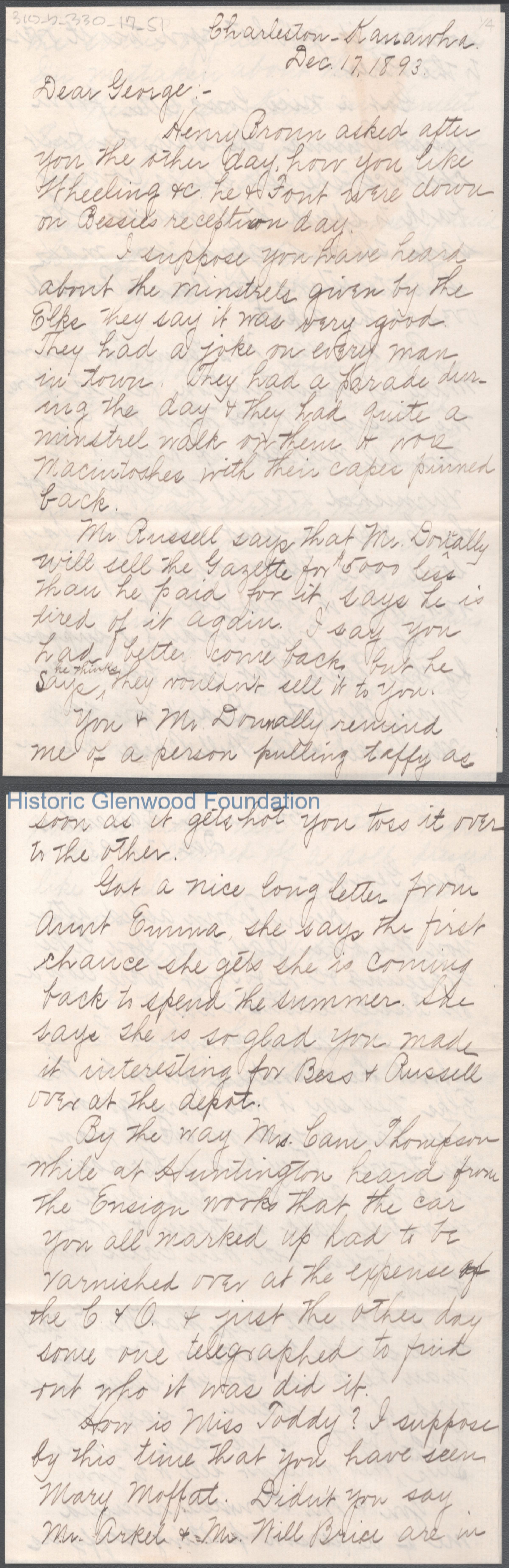 Four-page letter to George W. Summers from his sister Amacetta Summers, Dec 17, 1893.