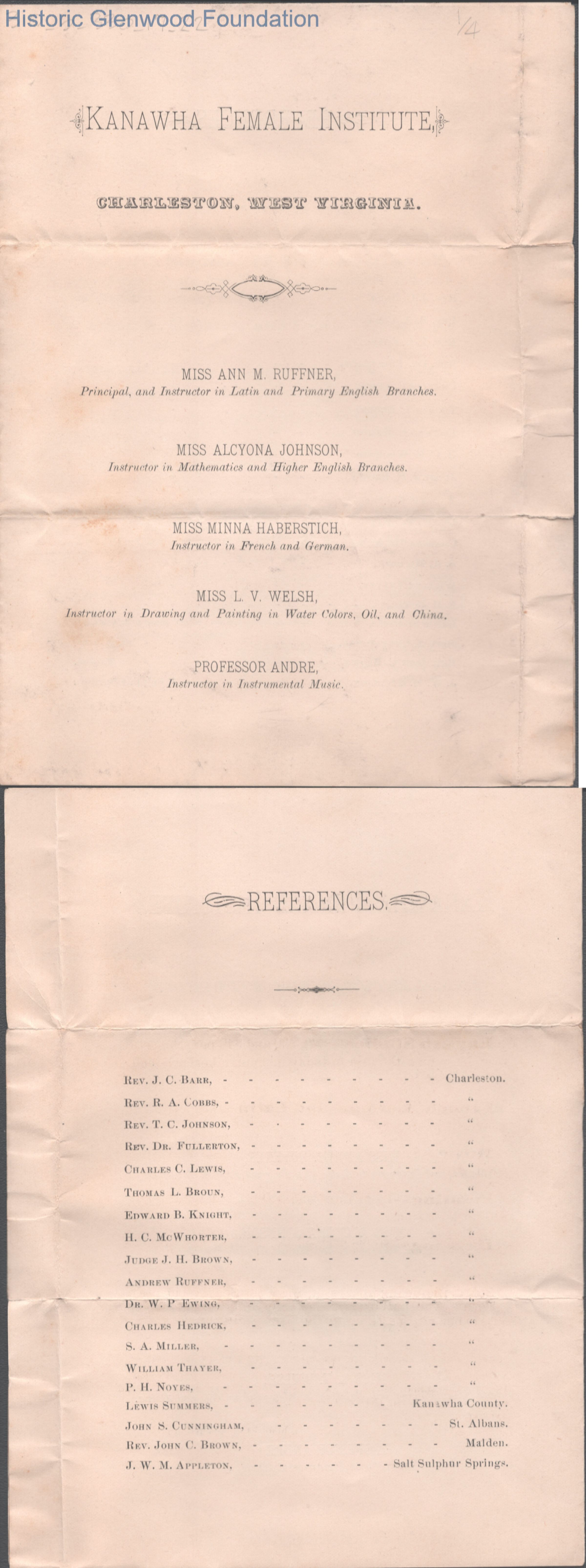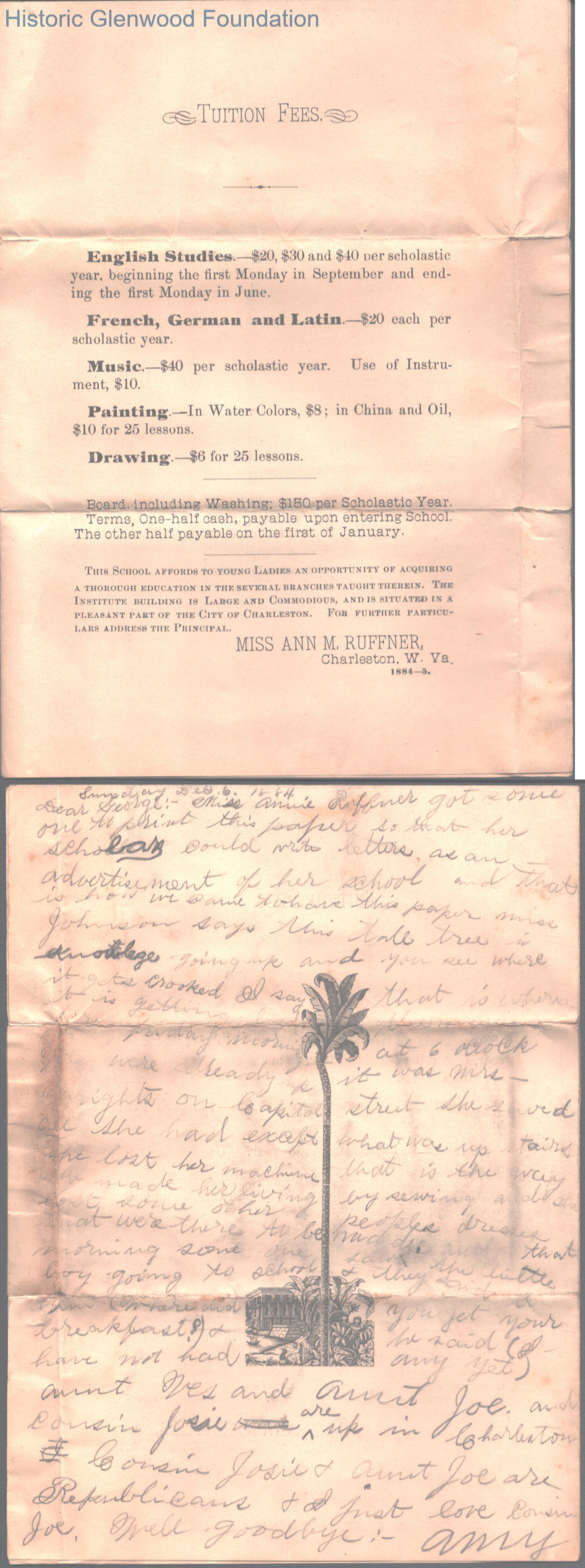 Single page letter to George W. Summers from his sister Amacetta Summers, Dec 6, 1884. Also includes booklet detailing Kanawha Female Institute in Charleston.