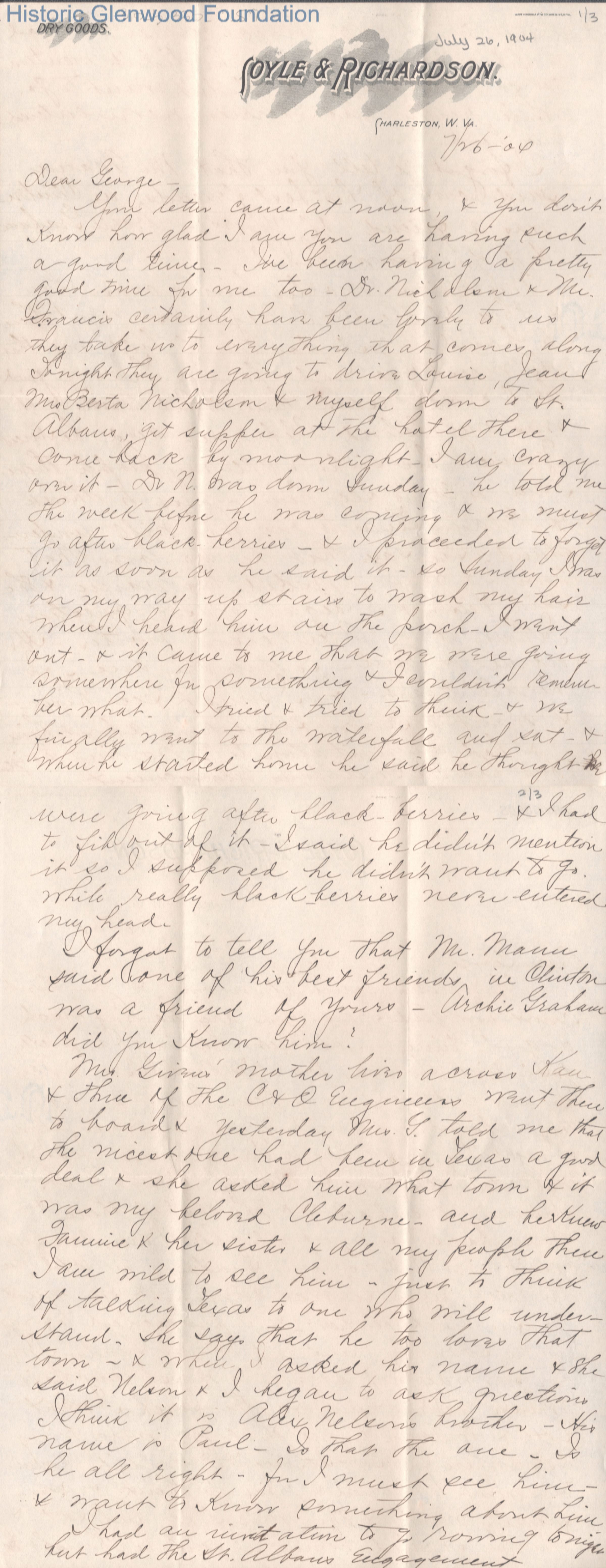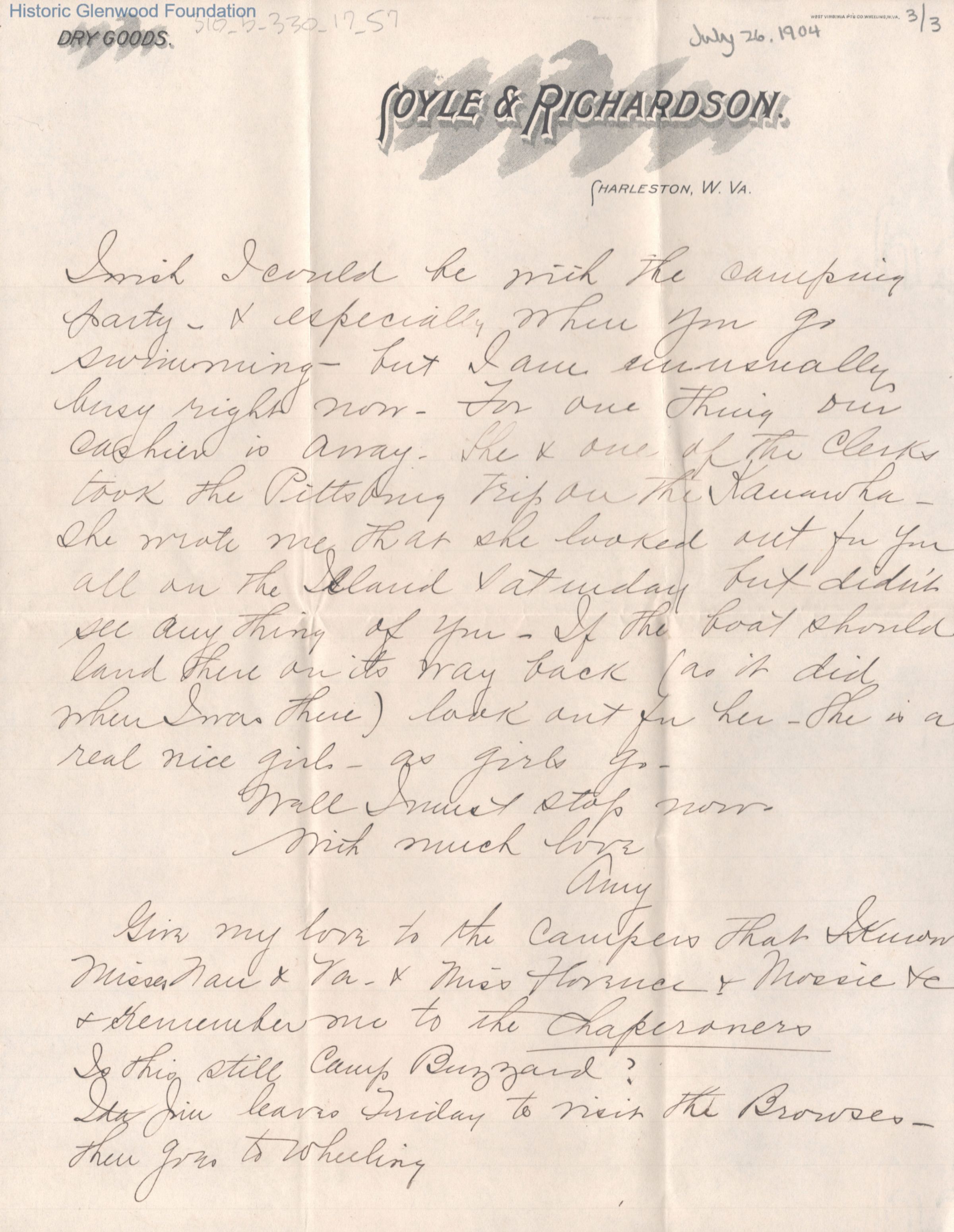 Three-page letter to George W. Summers from his sister Amacetta Summers, Jul 26, 1904.