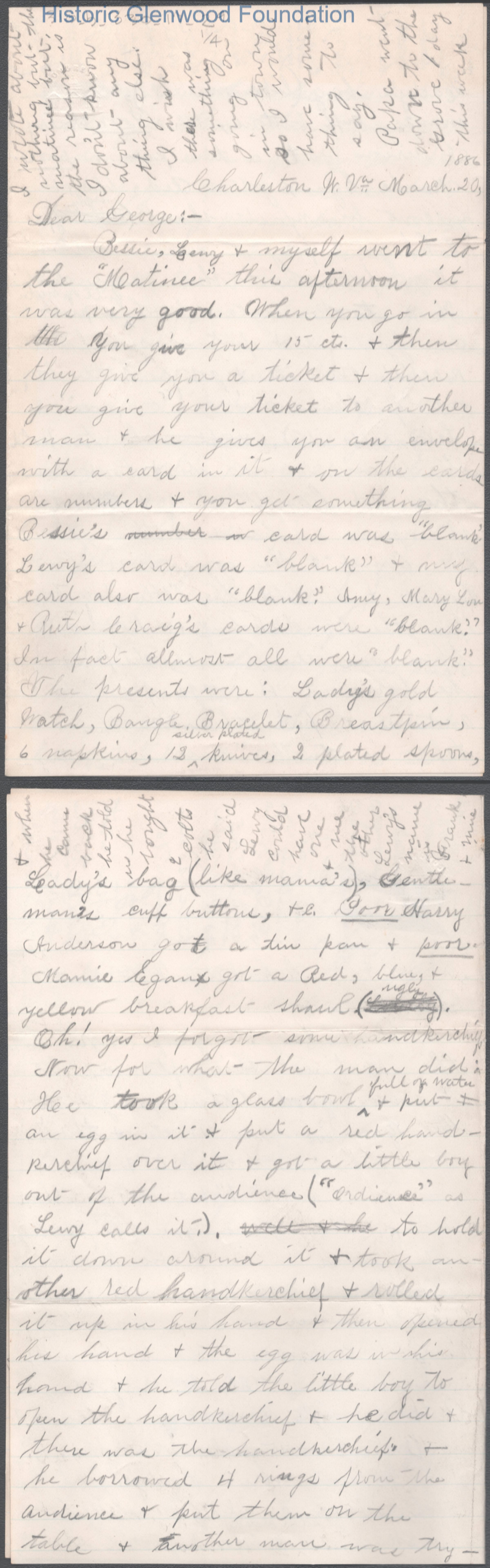 Four-page letter to George W. Summers from his sister Amacetta Summers, Mar 20, 1886.