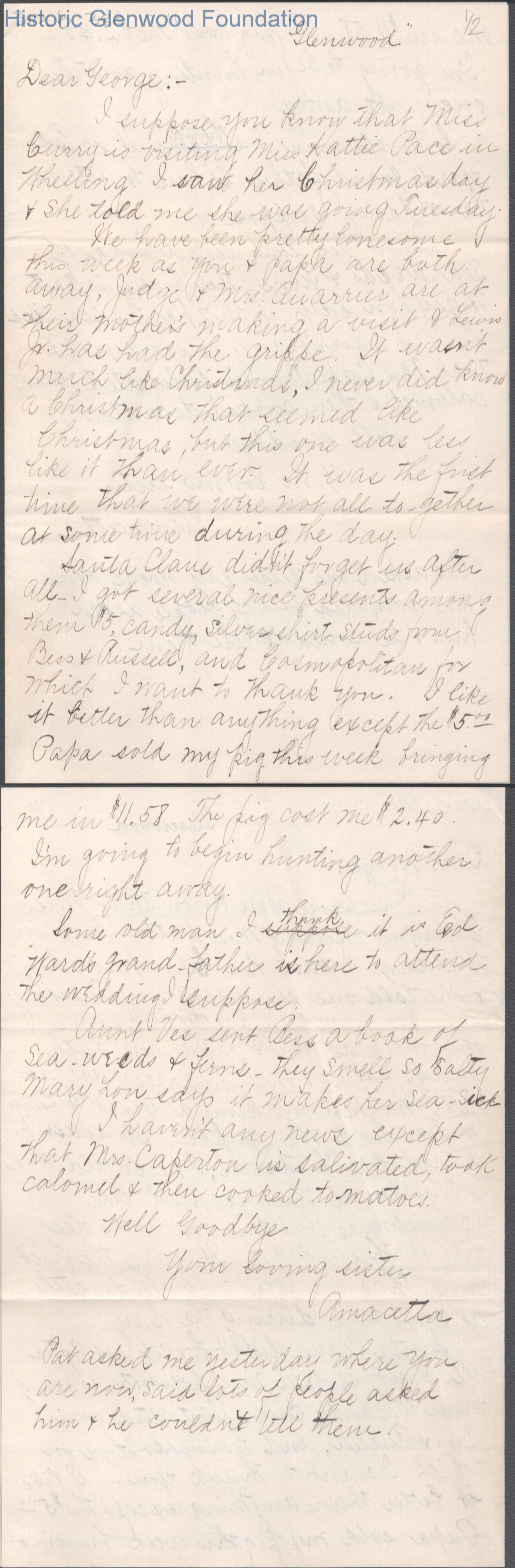 Two-page letter to George W. Summers from his sister Amacetta Summers, no date.