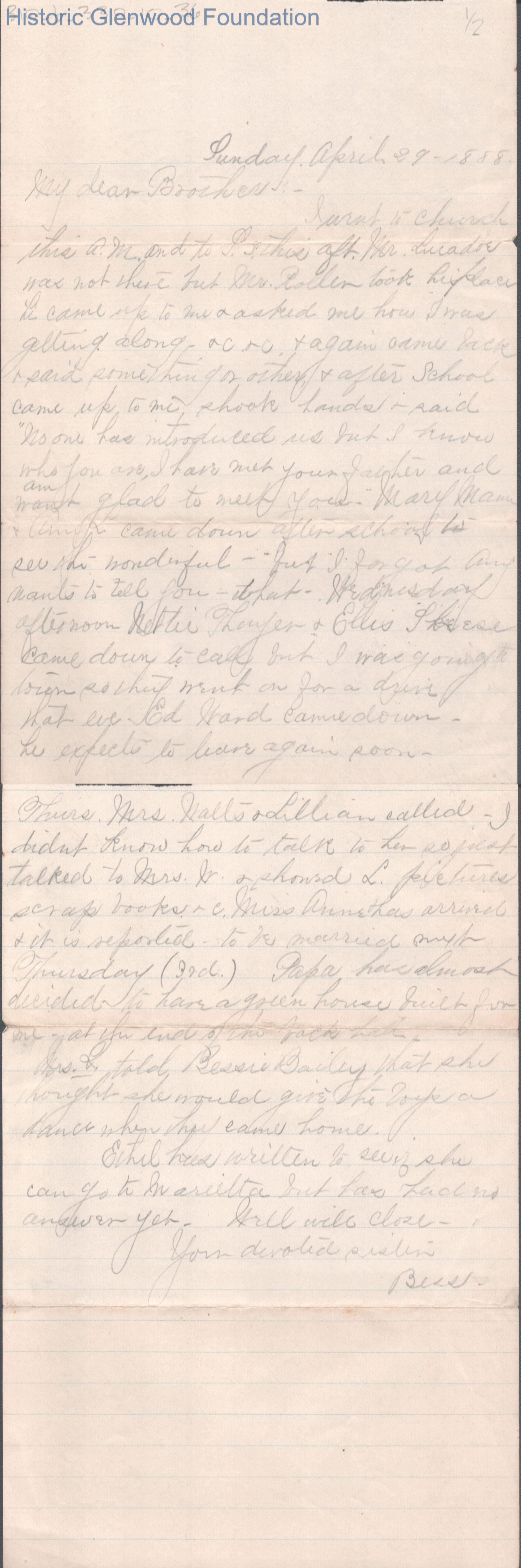 Two-page letter to George W. Summers from his sister Elizabeth S. Quarrier, Apr 29, 1888.