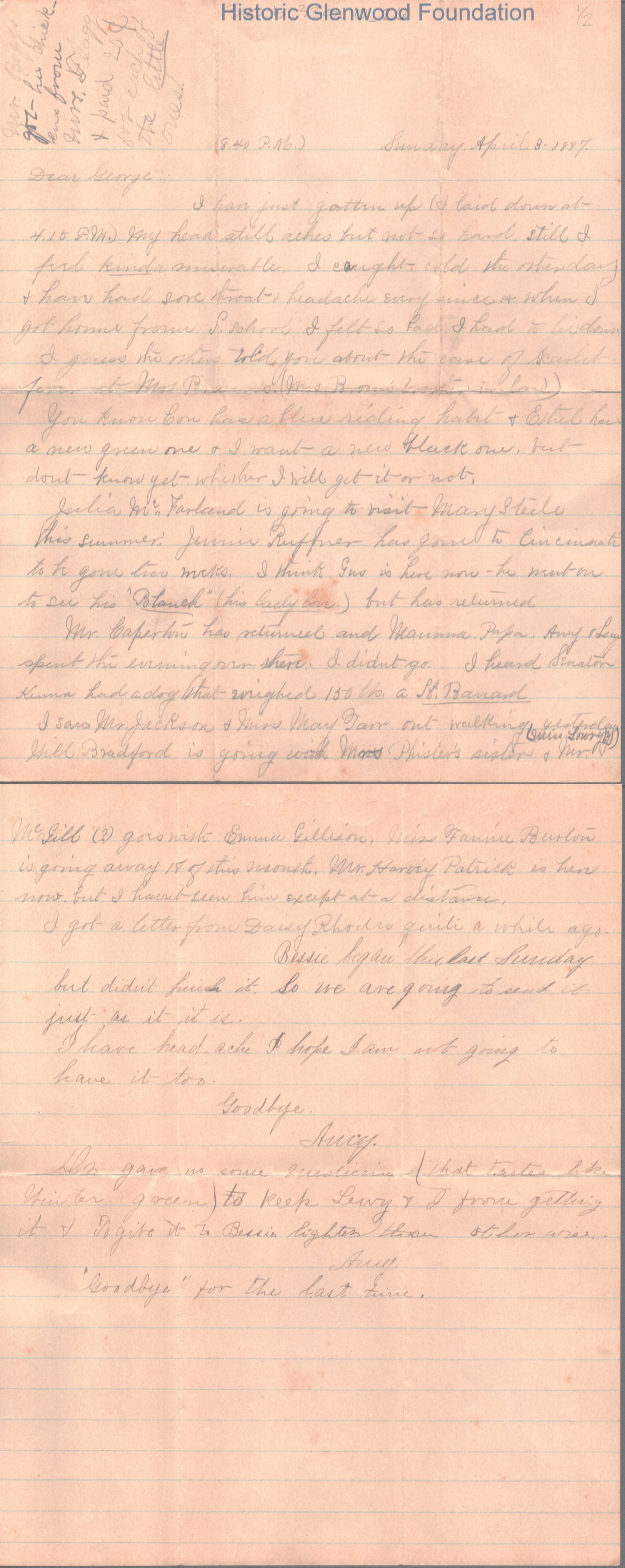 Two-page letter to George W. Summers from his sister Elizabeth S. Quarrier, Apr 3, 1887.