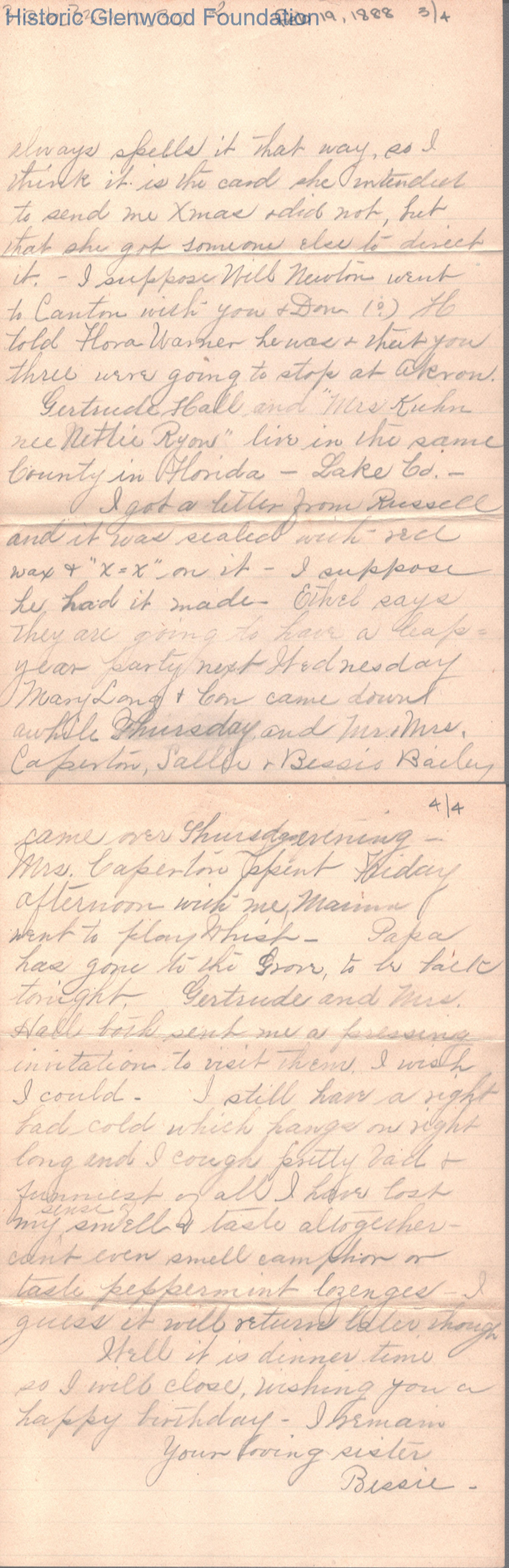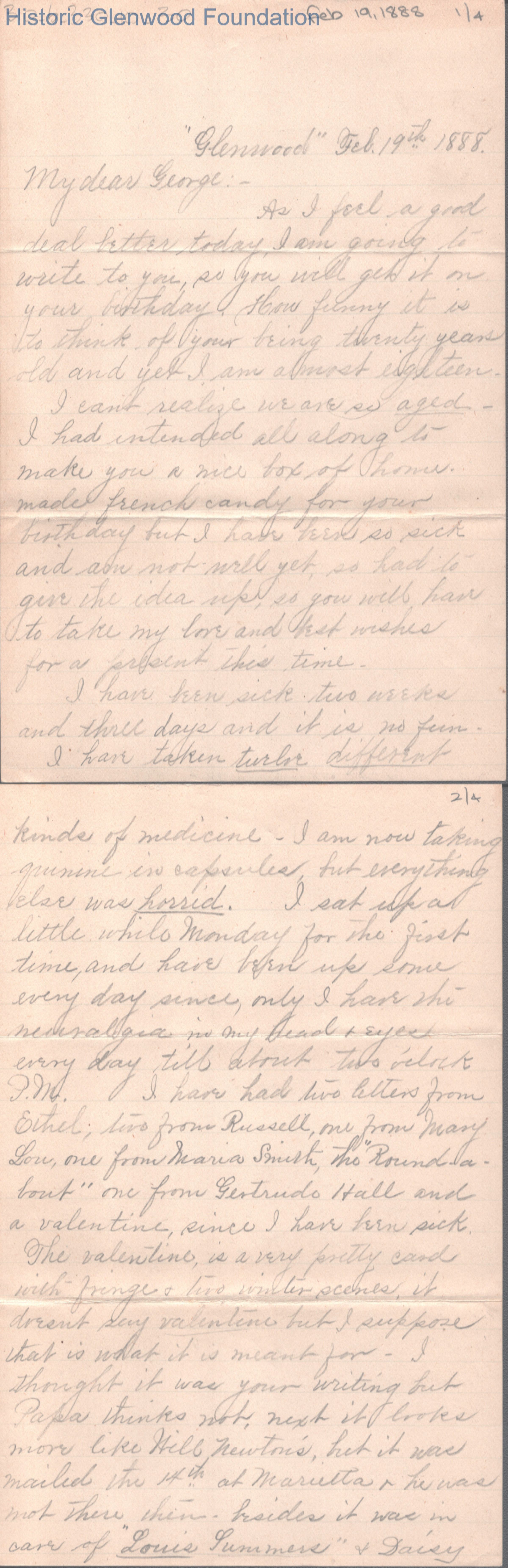 Four-page letter to George W. Summers from his sister Elizabeth S. Quarrier, Feb 19, 1888.