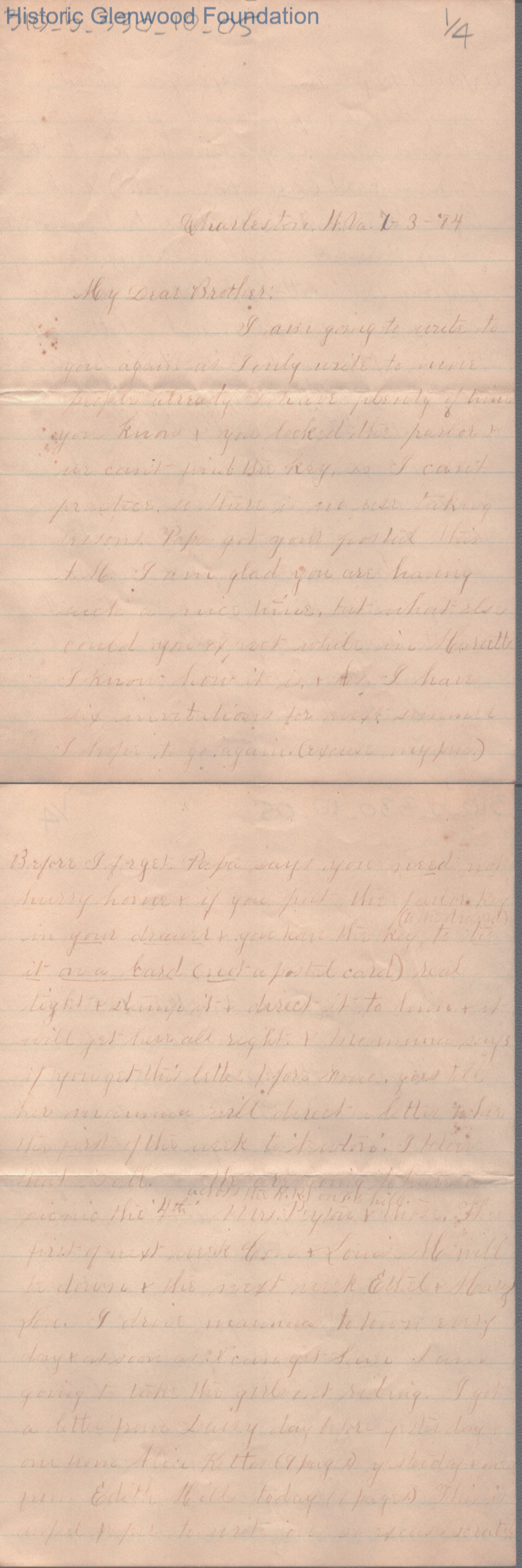 Four-page letter to George W. Summers from his sister Elizabeth S. Quarrier, Jul 3, 1884.