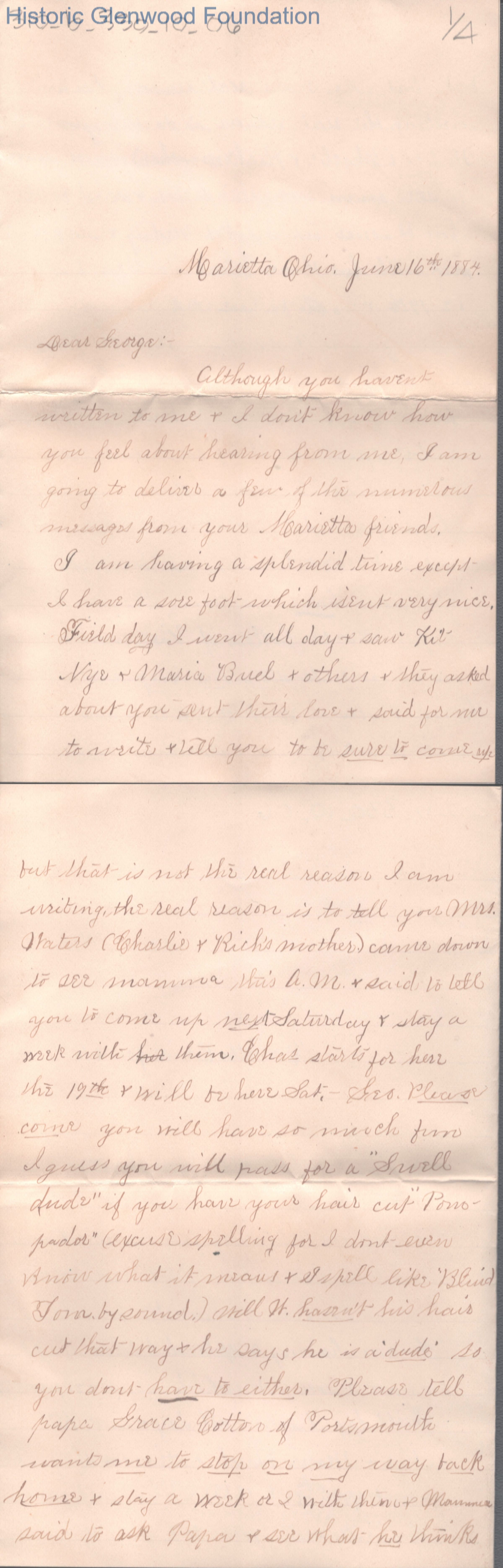 Four-page letter to George W. Summers from his sister Elizabeth S. Quarrier, Jun 16, 1884.