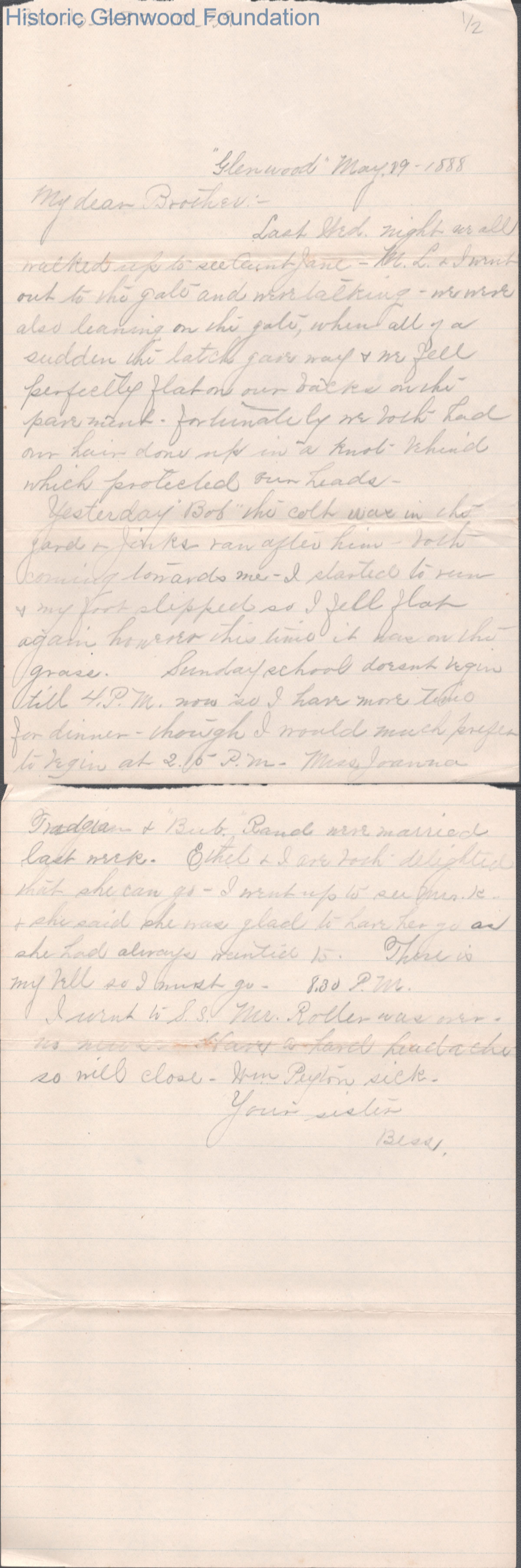 Two-page letter to George W. Summers from his sister Elizabeth S. Quarrier, May 19, 1888.