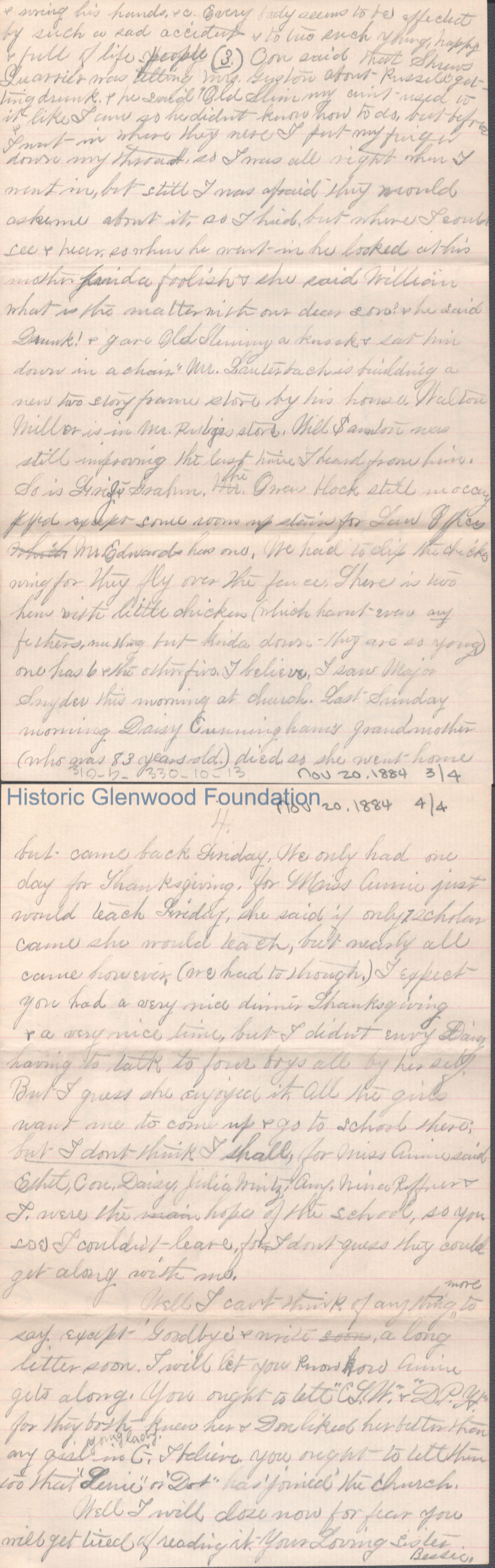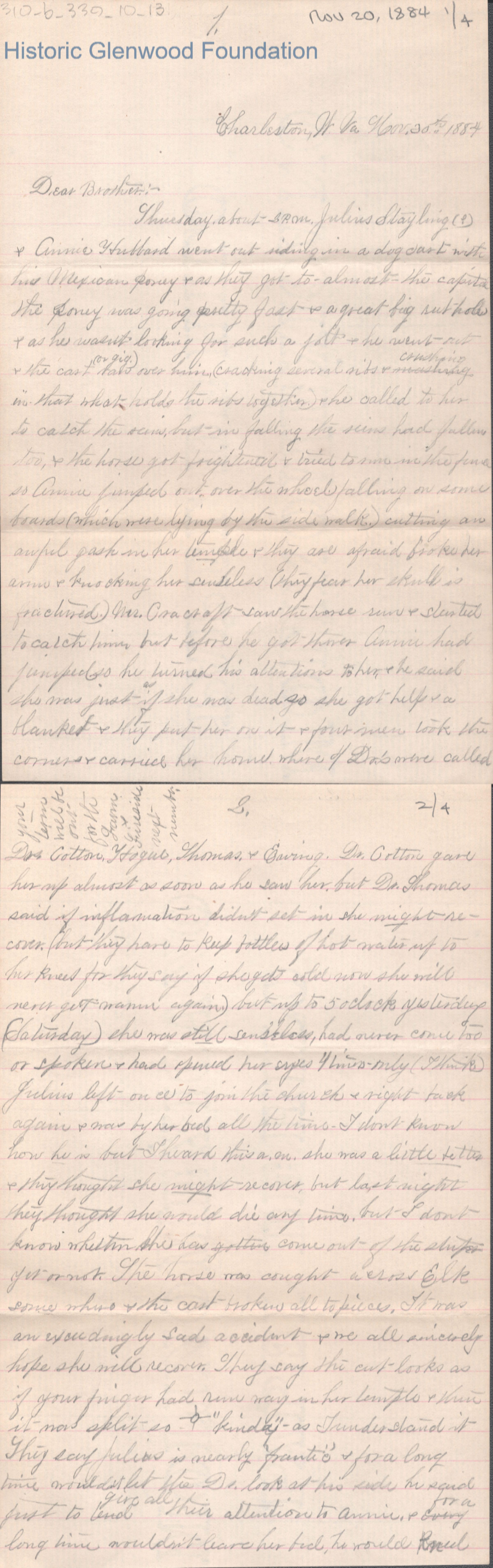Four-page letter to George W. Summers from his sister Elizabeth S. Quarrier, Nov 20, 1884.