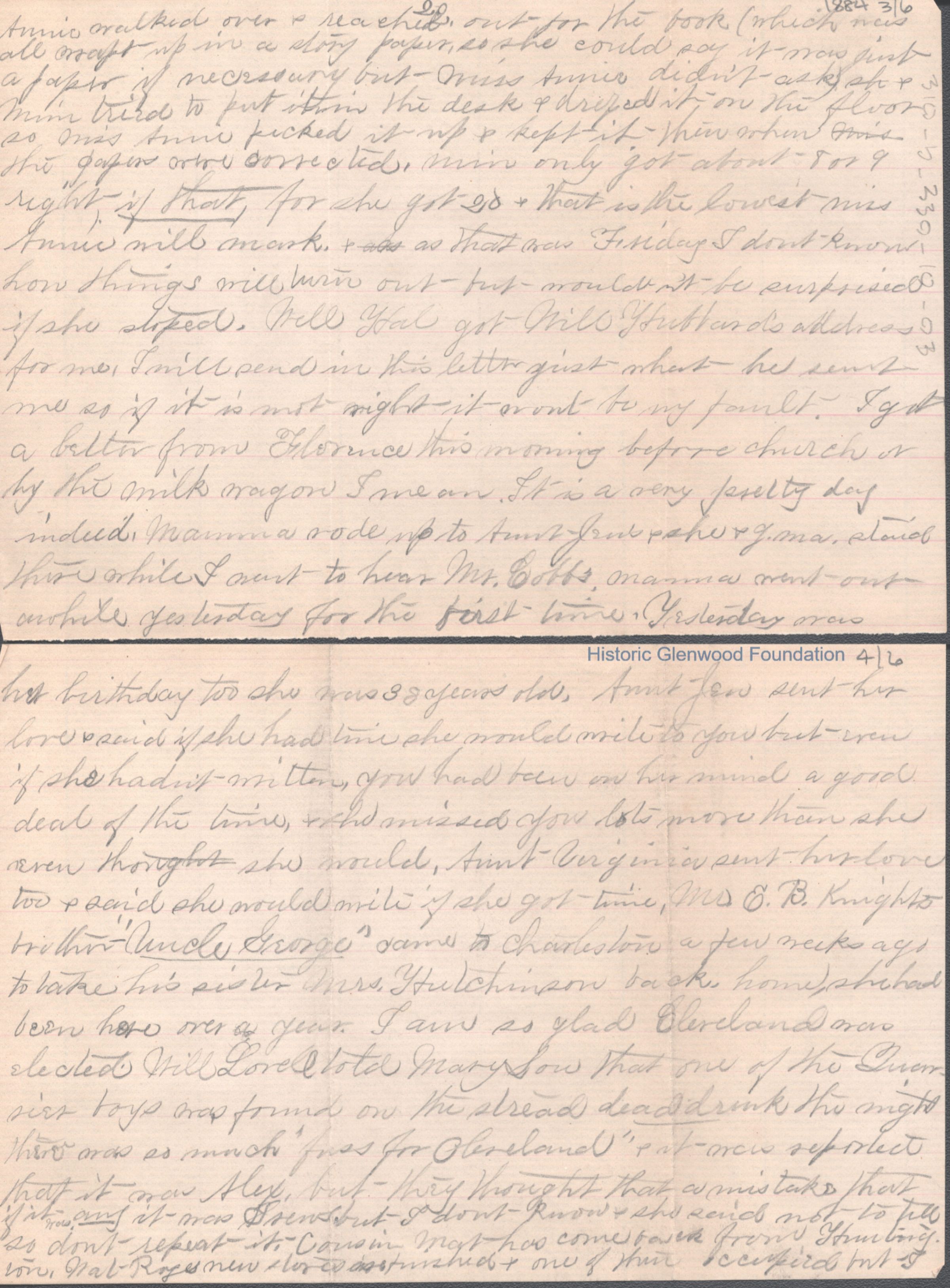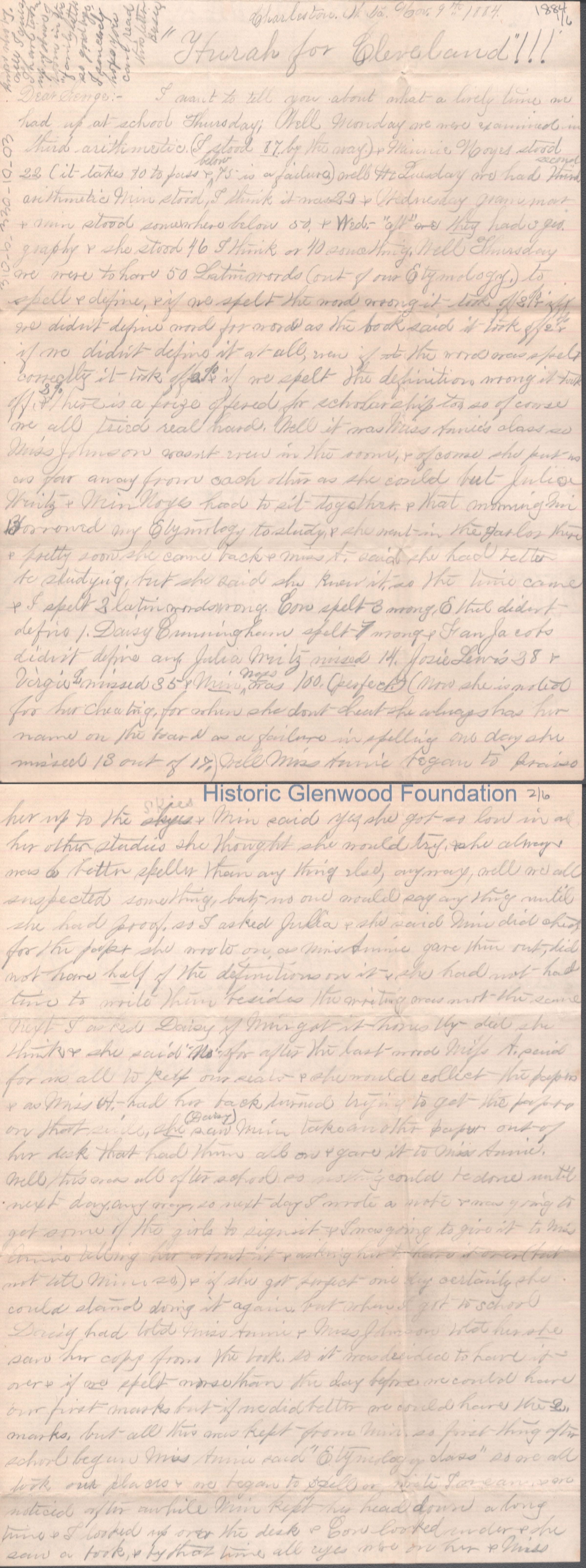 Six-page letter to George W. Summers from his sister Elizabeth S. Quarrier, Nov 9, 1884.