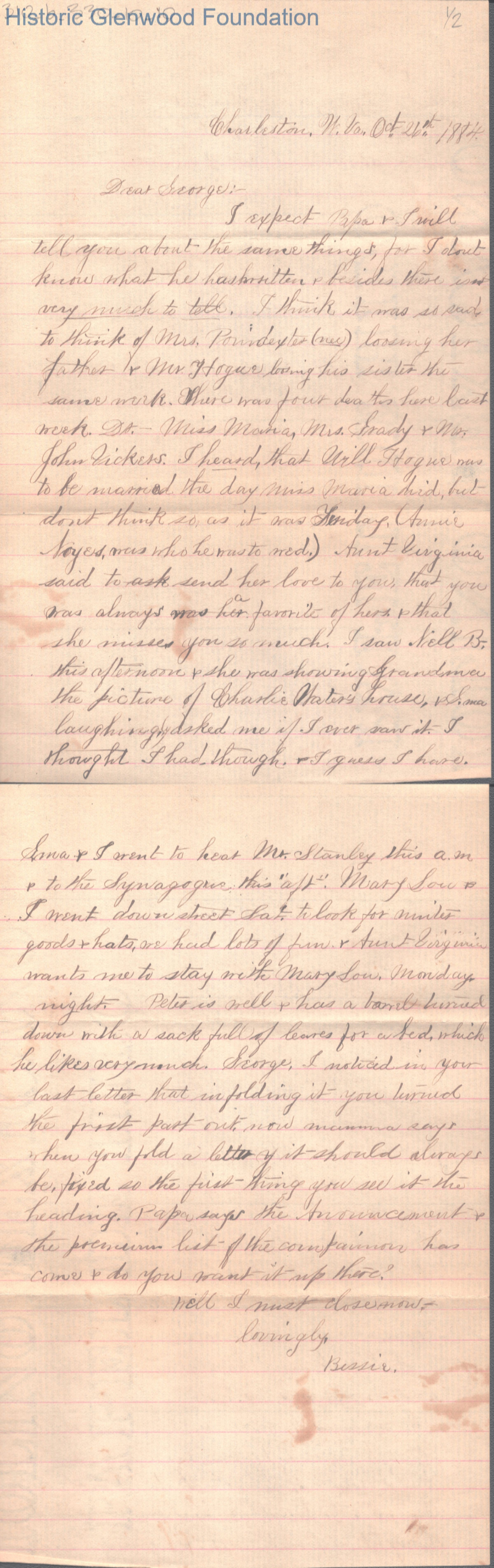 Two-page letter to George W. Summers from his sister Elizabeth S. Quarrier, Oct 26, 1884.