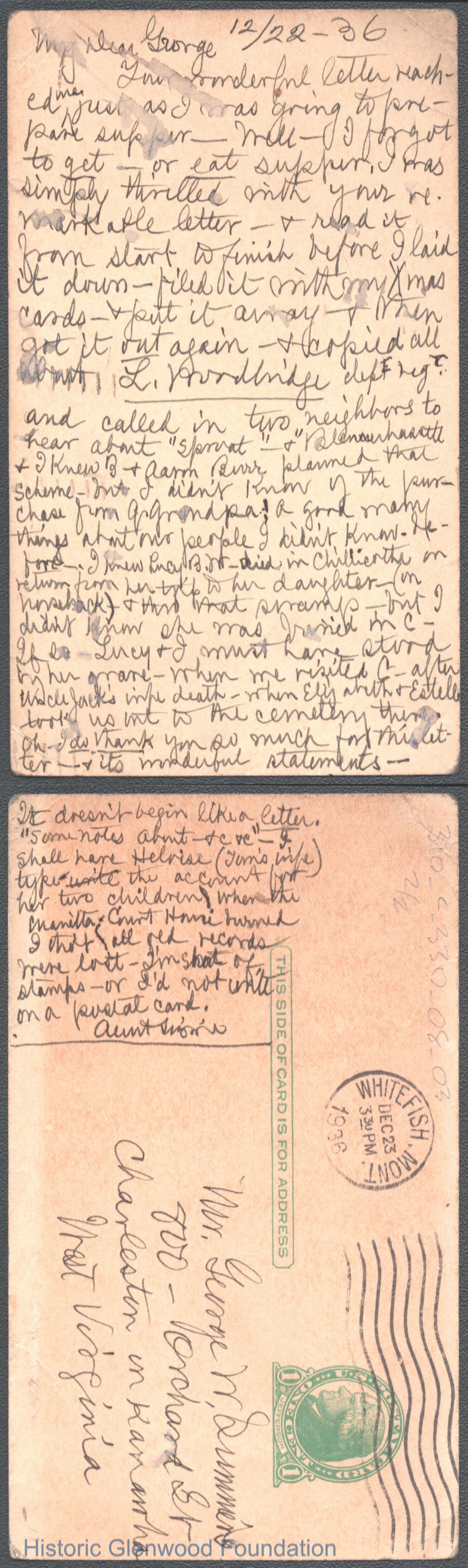 Postcard to George W. Summers from his aunt Elizabeth W. Wickes, Dec 22, 1936.