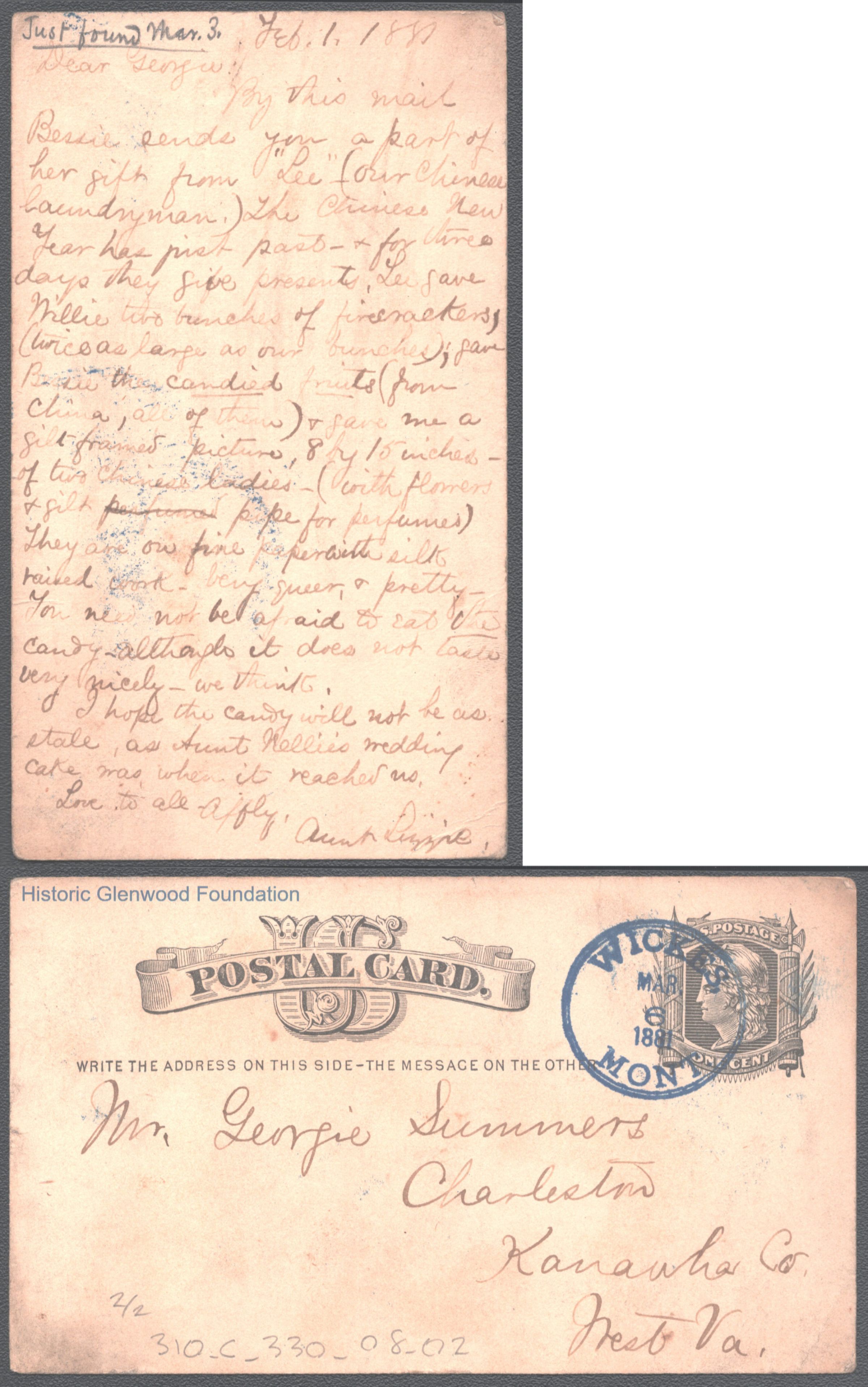 Postcard to George W. Summers from his aunt Elizabeth W. Wickes, Feb 1, 1881.