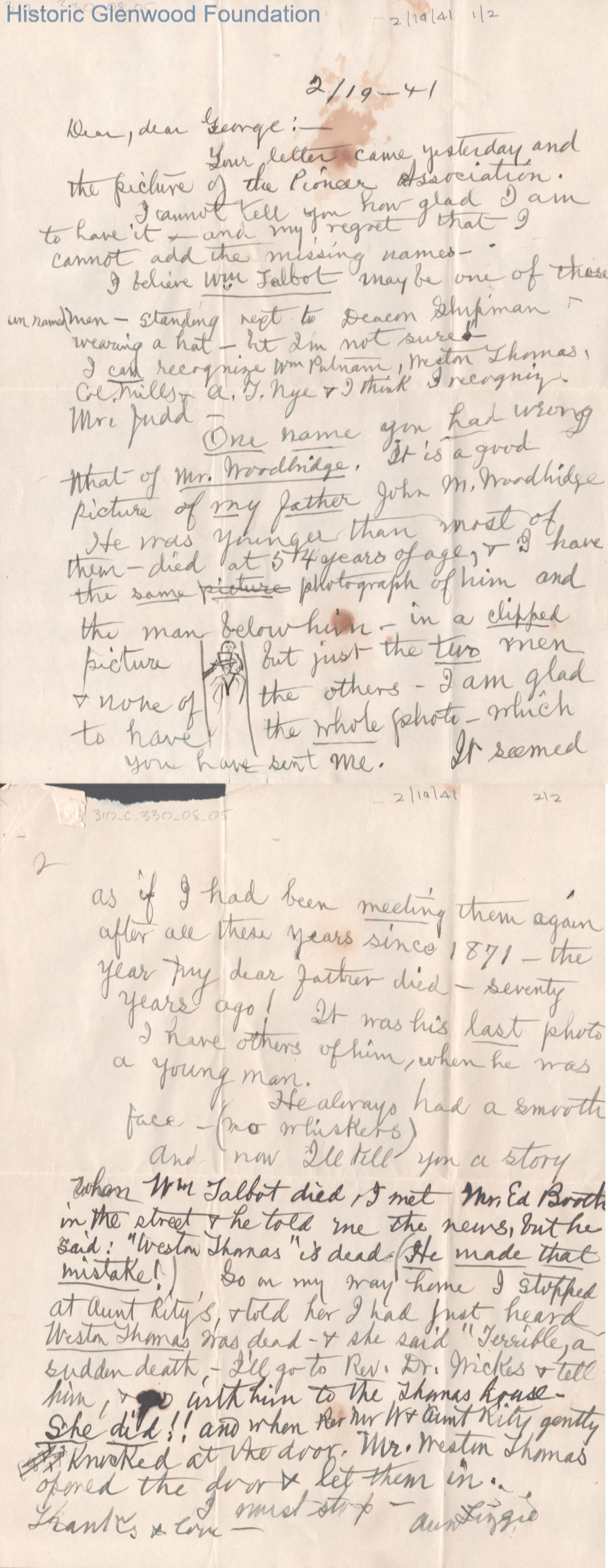 Two-page letter to George W. Summers from Elizabeth W. Wickes ("Aunt Lizzie"), Feb 19, 1941.