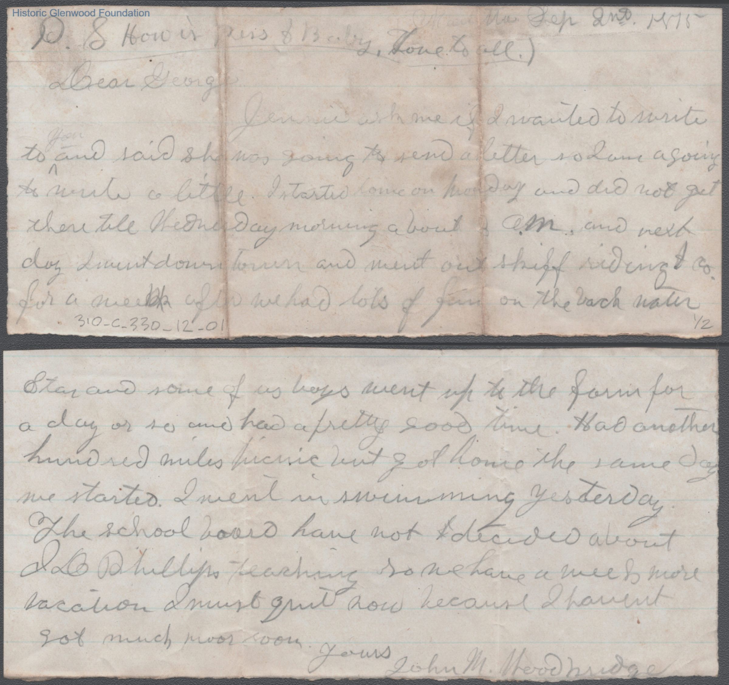 Brief two-page letter to George W. Summers from his uncle John Woodbridge, Sep 2, 1875.