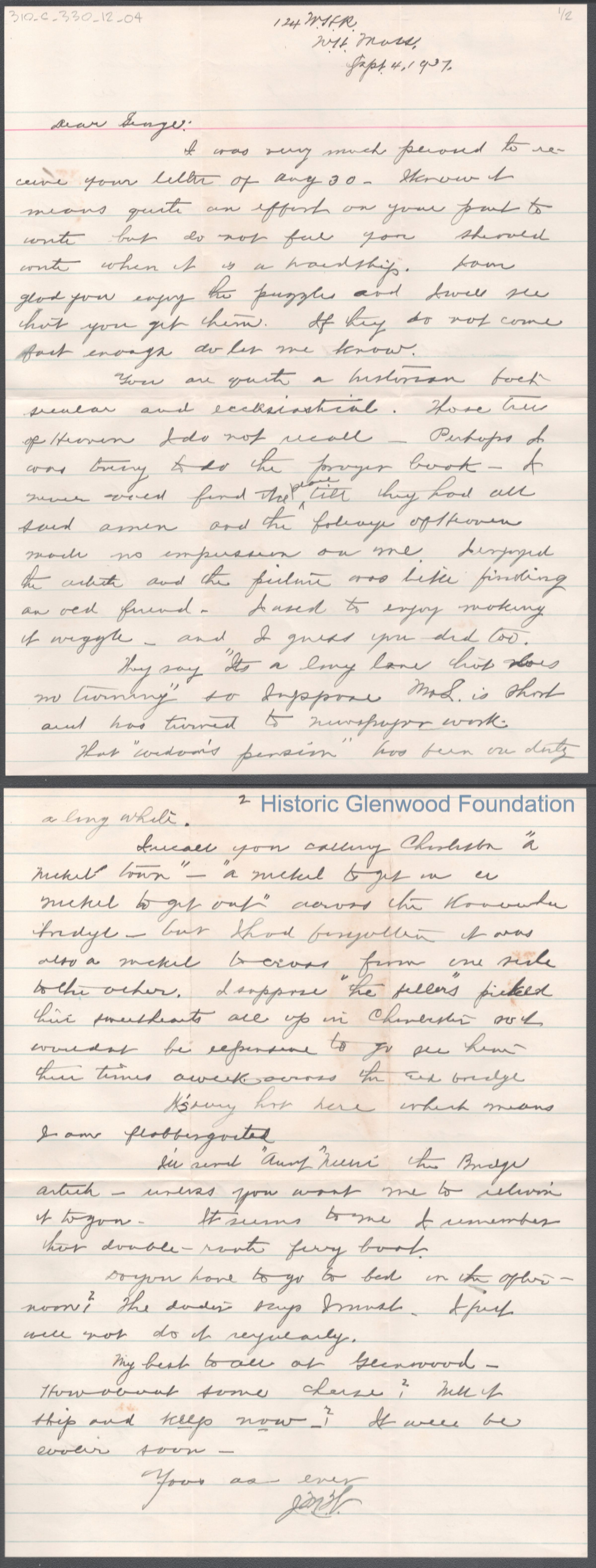 Two-page letter to George W. Summers from his uncle John Woodbridge, Sep 4, 1907.