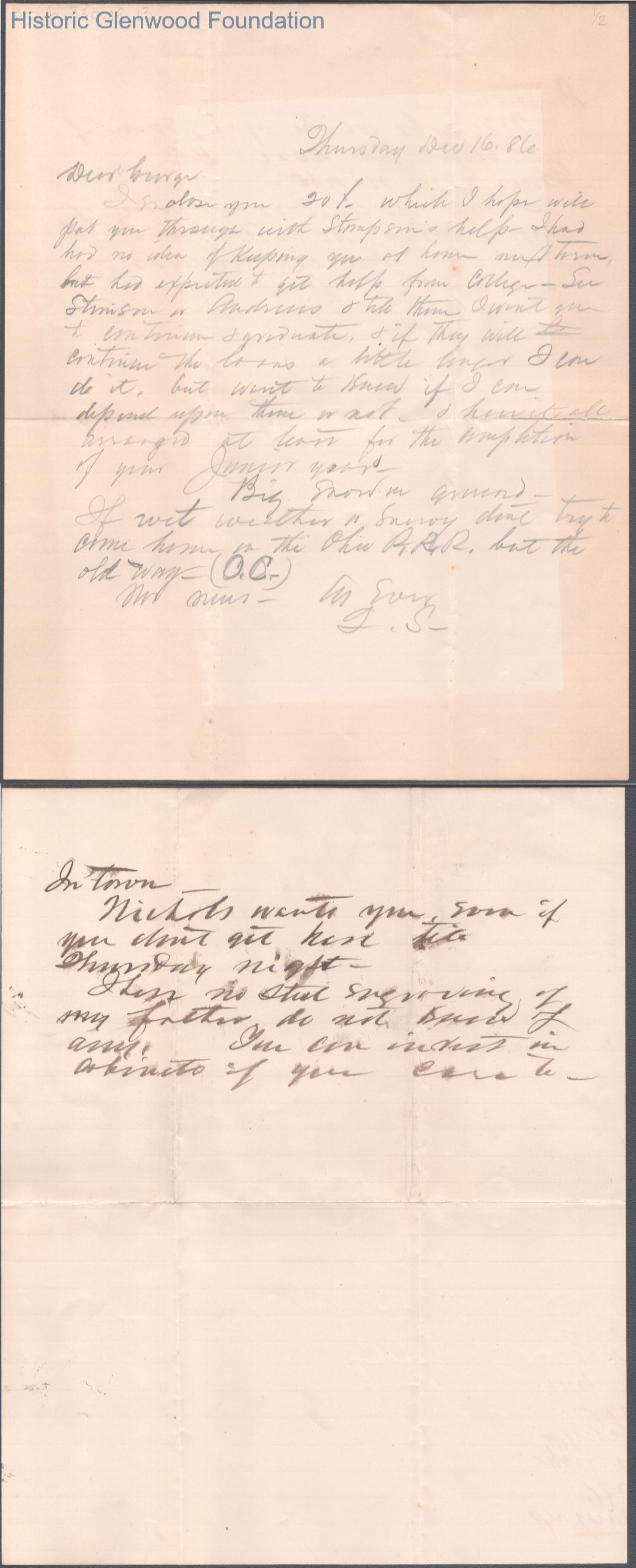 Two-page letter to George W. Summers from his father Lewis Summers, Dec 16, 1886.