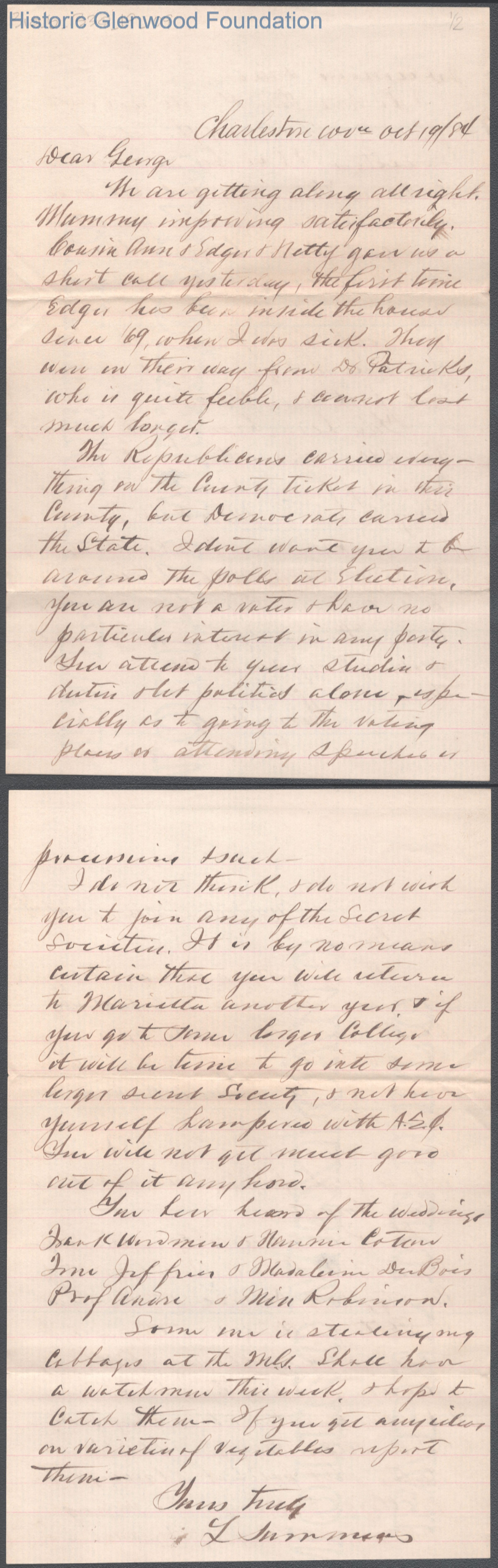 Two-page letter to George W. Summers from Lewis Summers, Oct 19, 1884.