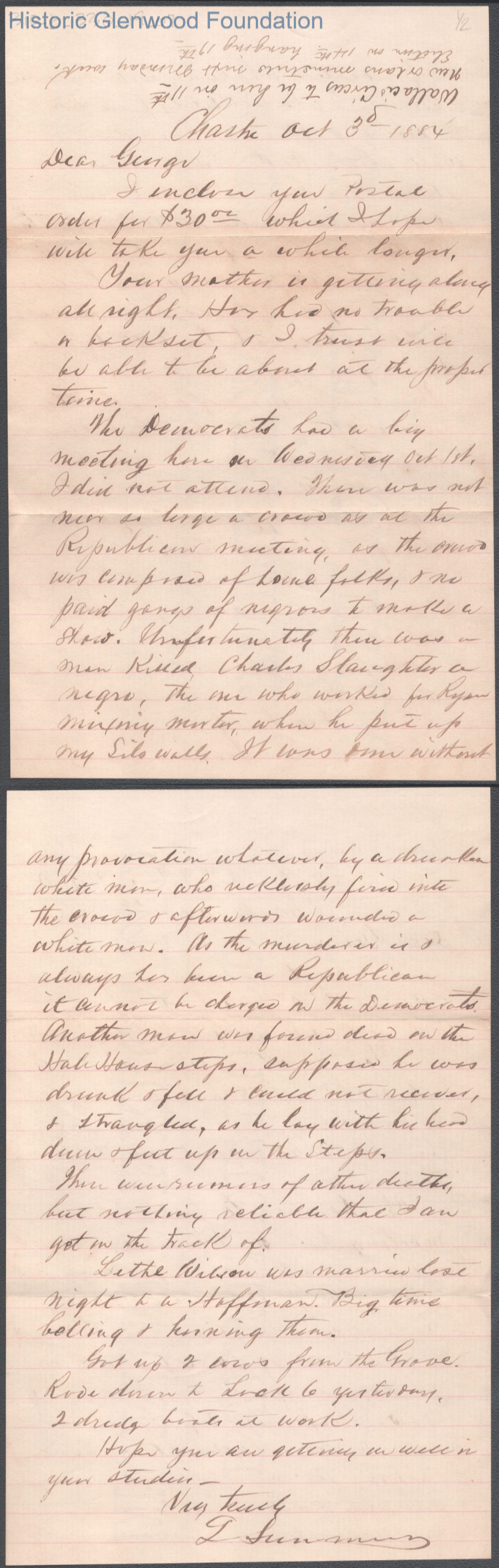 Two-page letter to George W. Summers from his father Lewis Summers, Oct 3, 1884.