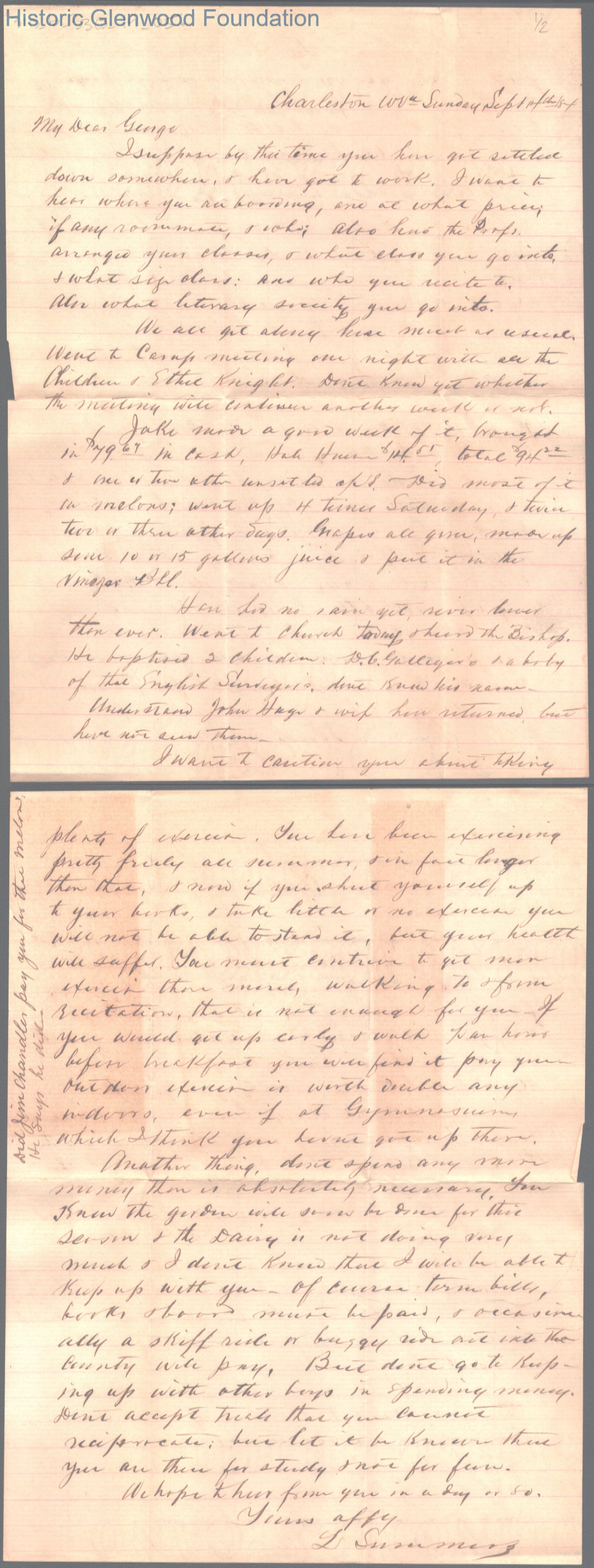 Two-page letter to George W. Summers from his father Lewis Summers, Sep 14, 1884.