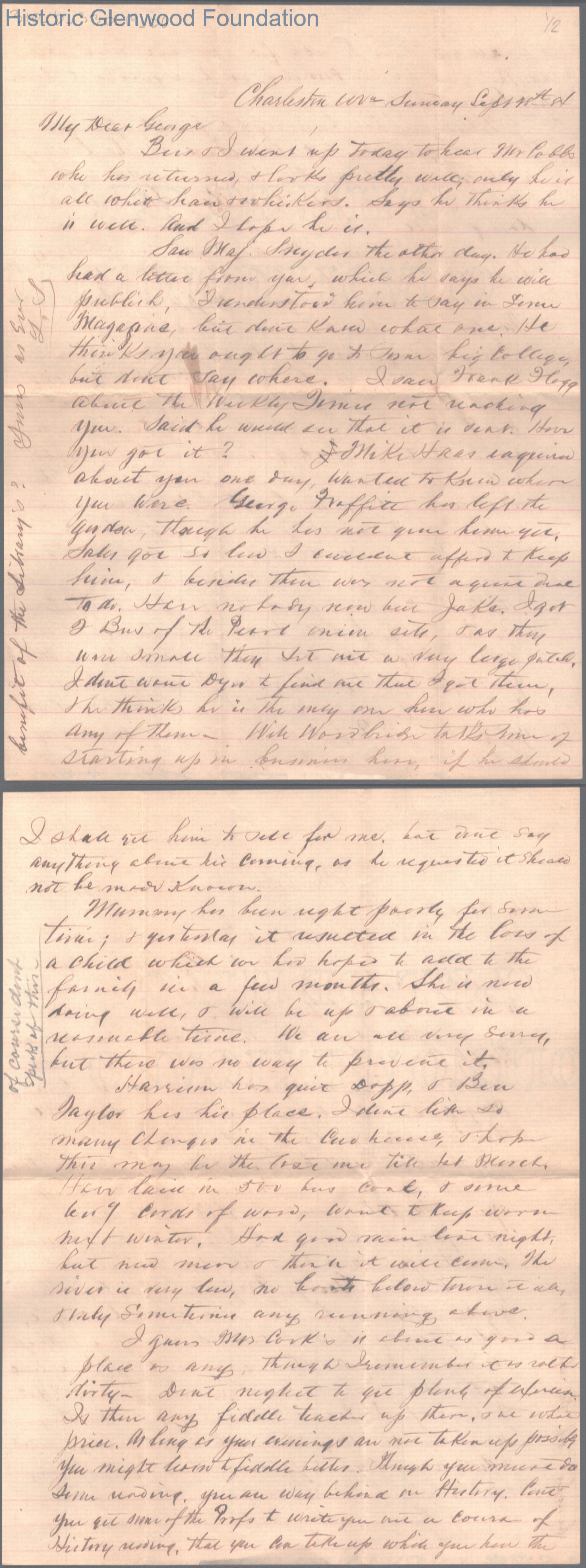 Two-page letter to George W. Summers from his father Lewis Summers, Sep 18, 1884.