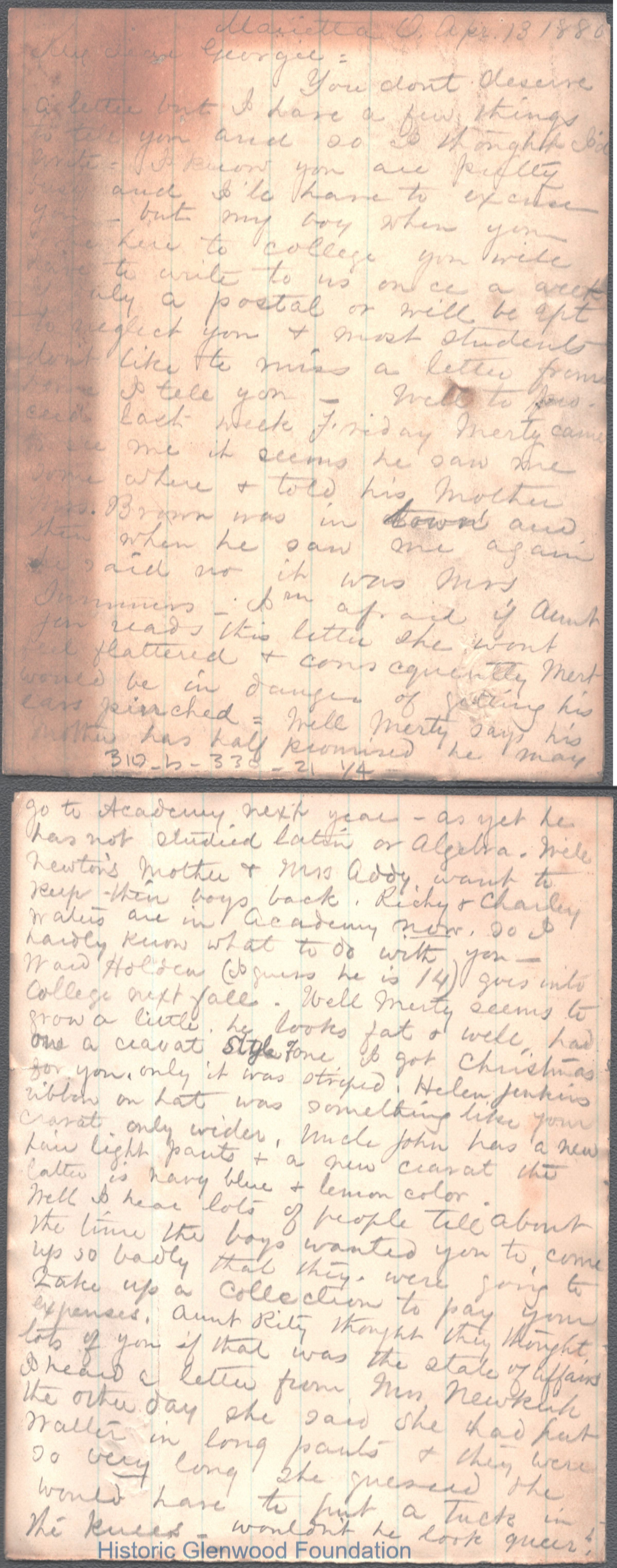 Four-page letter to George W. Summers from his mother Lucy W. Summers, Apr 13, 1886.
