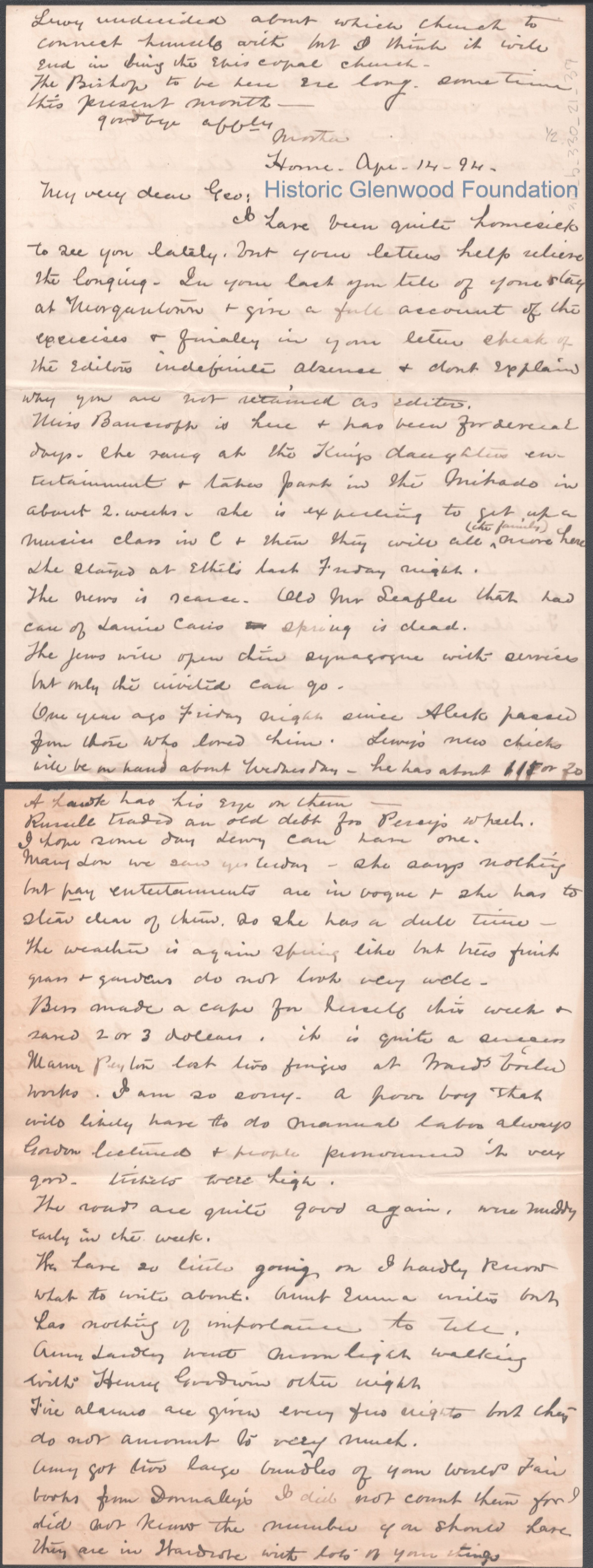 Two-page letter to George W. Summers from his mother Lucy W. Summers, Apr 14, 1894.