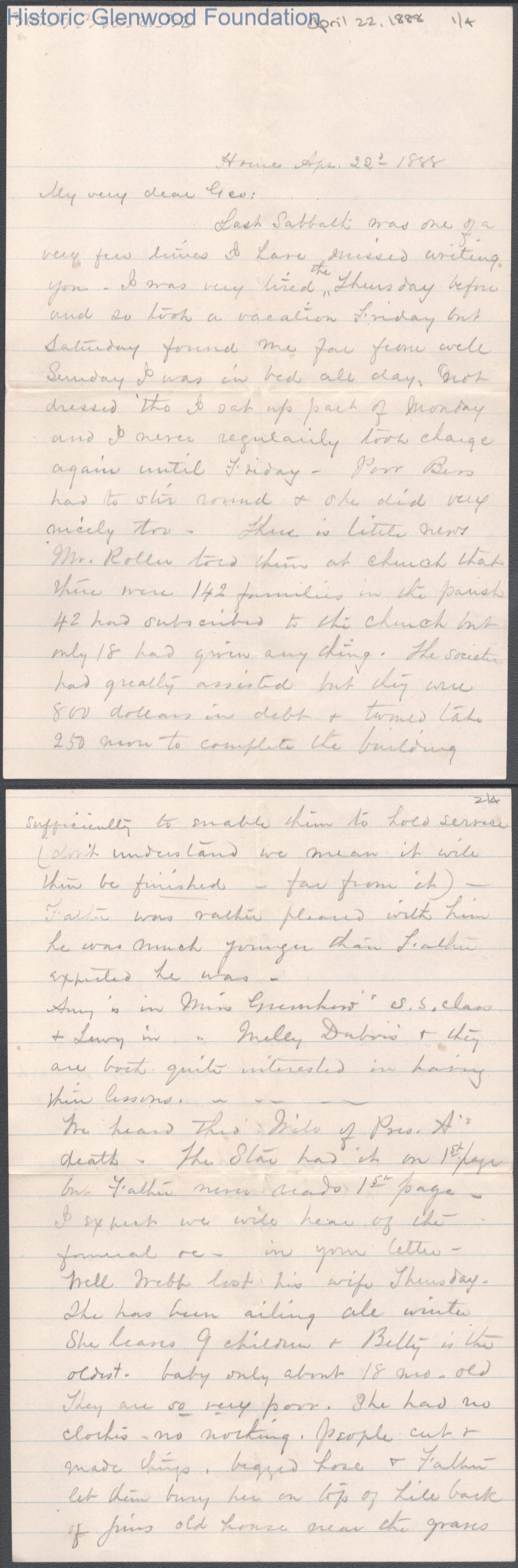 George W. Summers from Lucy W. Summers, Apr 22, 1888