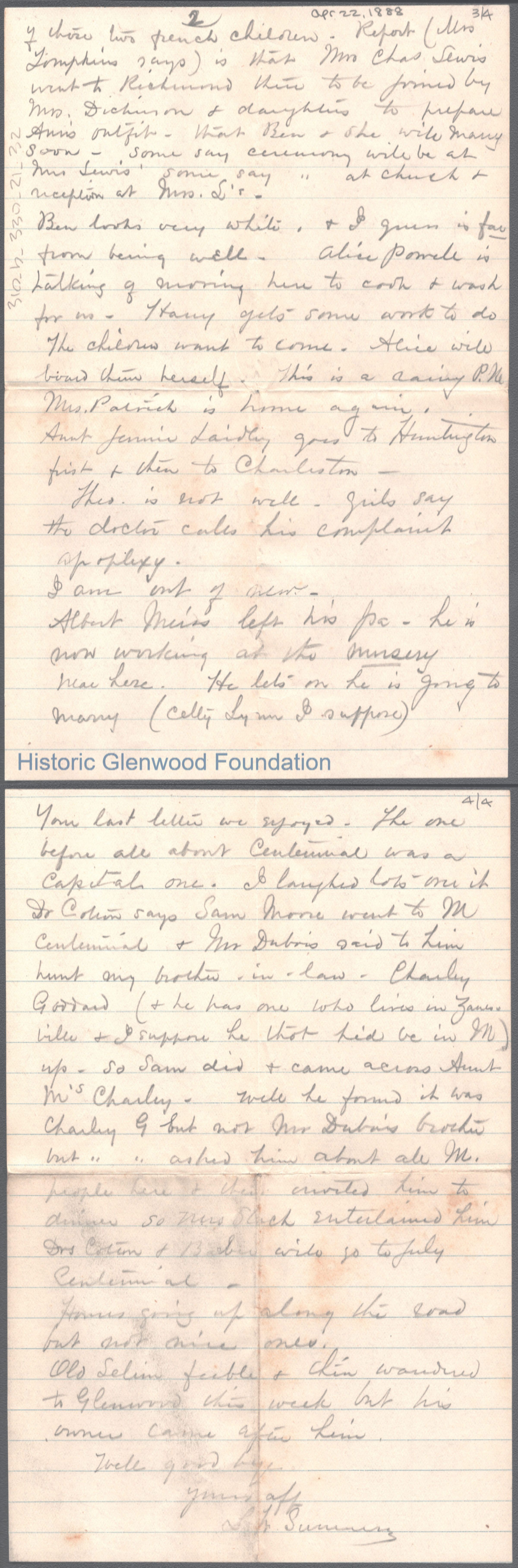 Four-page letter to George W. Summers from his mother Lucy W. Summers, Apr 22, 1888.