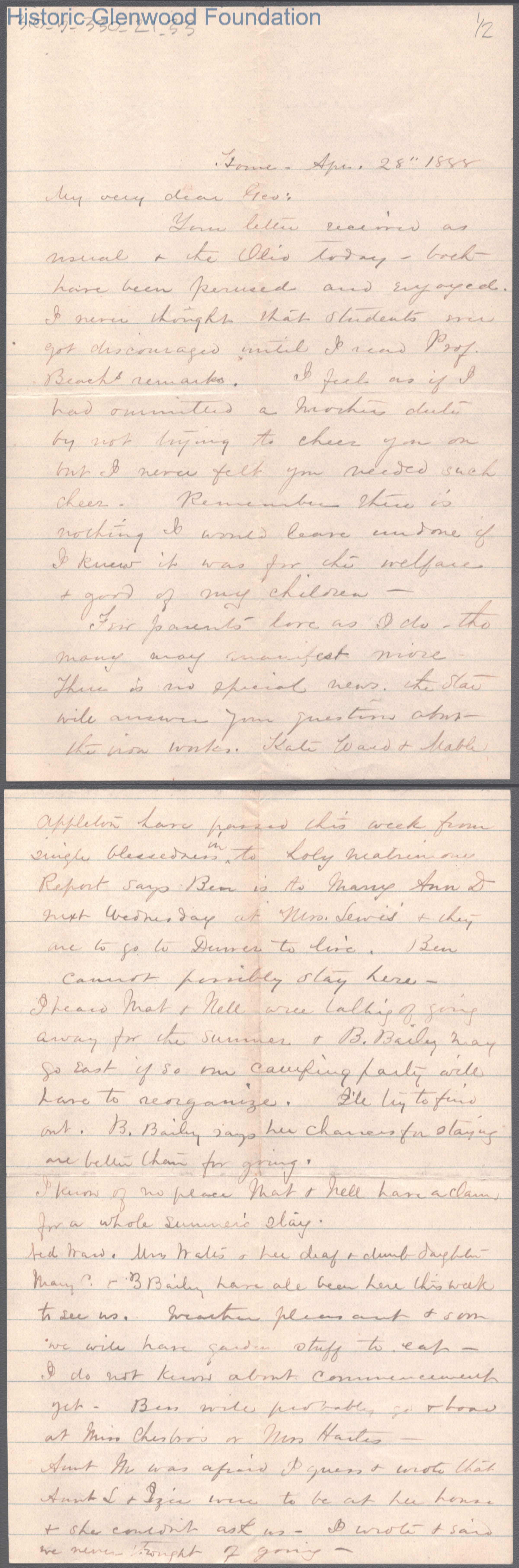 Two-page letter to George W. Summers from his mother Lucy W. Summers, Apr 28, 1888.