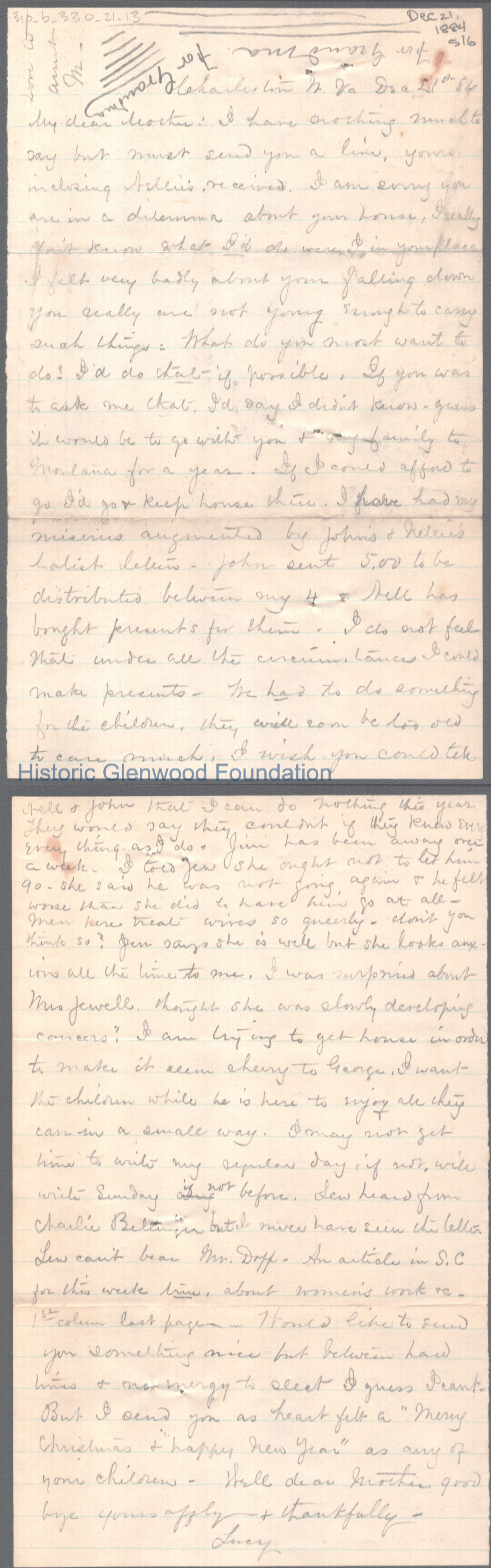 Six-page letter to George W. Summers from his mother Lucy W. Summers, Dec 21, 1884.