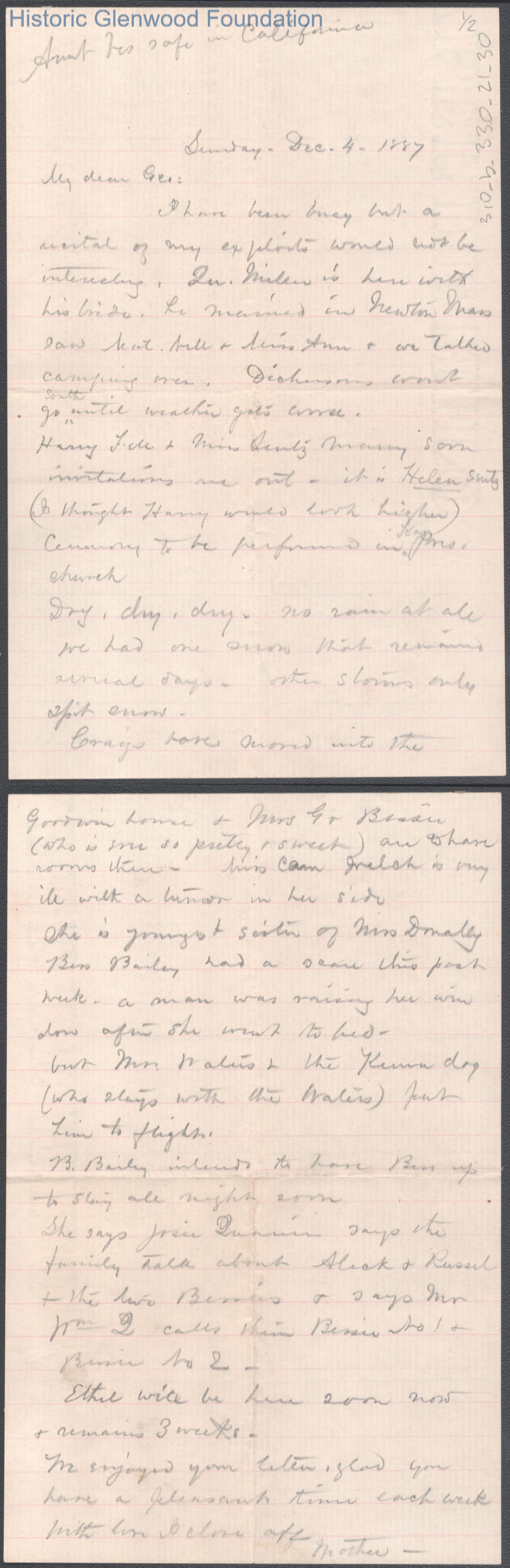 Two-page letter to George W. Summers from his mother Lucy W. Summers, Dec 4, 1887.