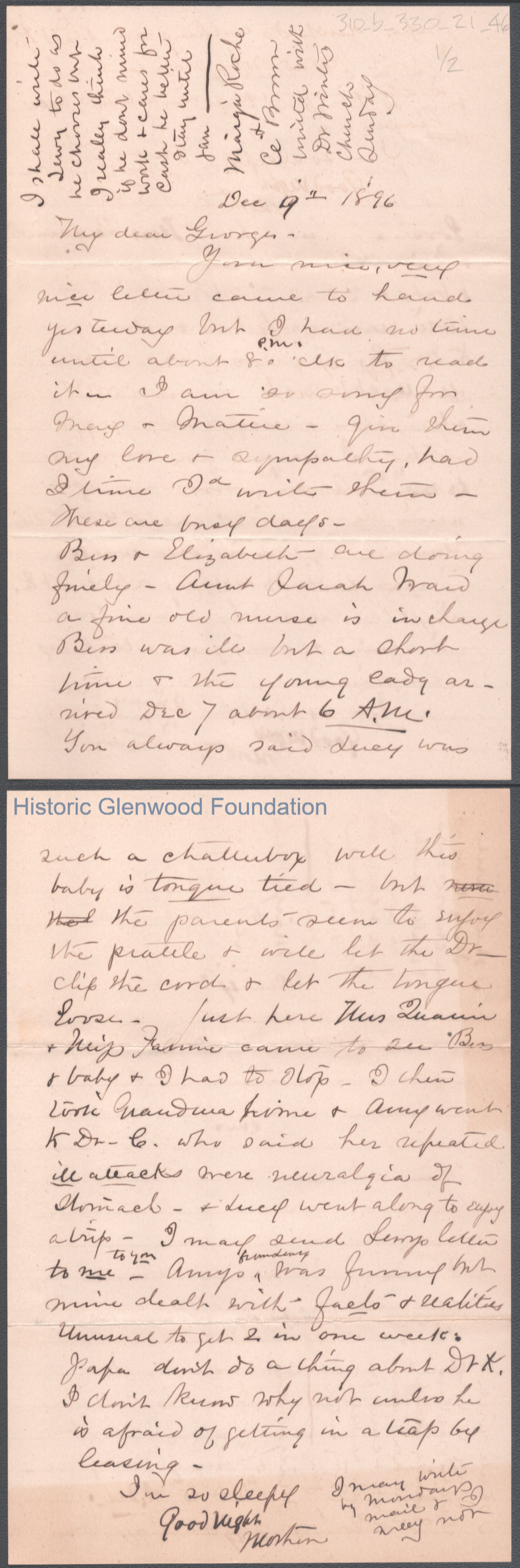 Two-page letter to George W. Summers from his mother Lucy W. Summers, Dec 9, 1896.