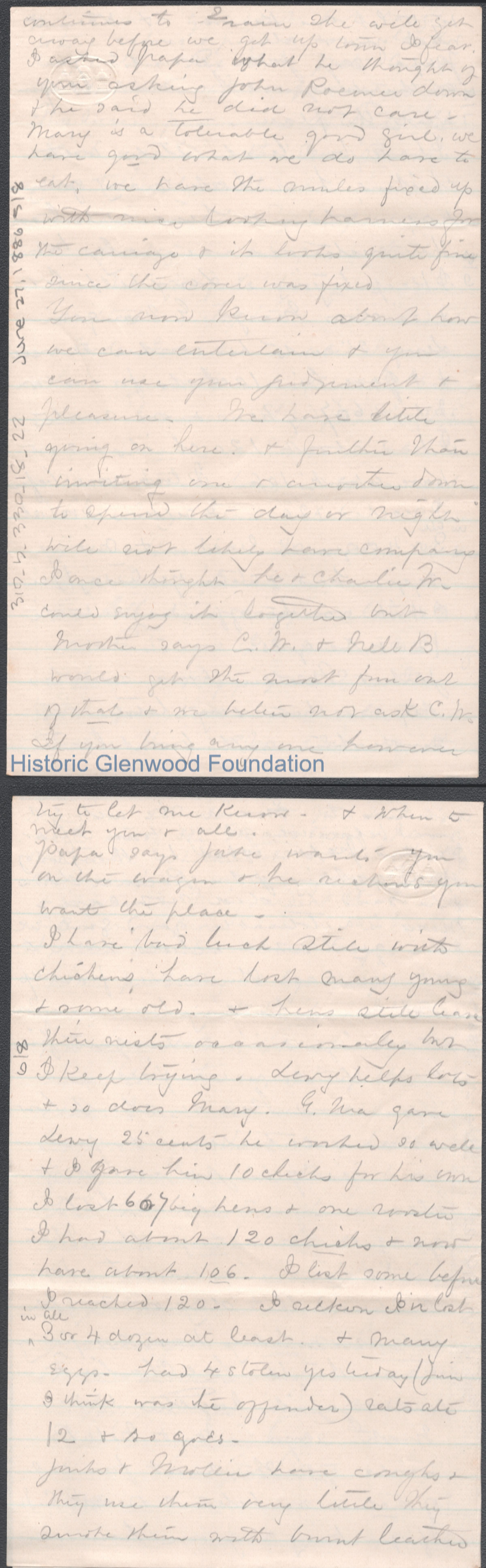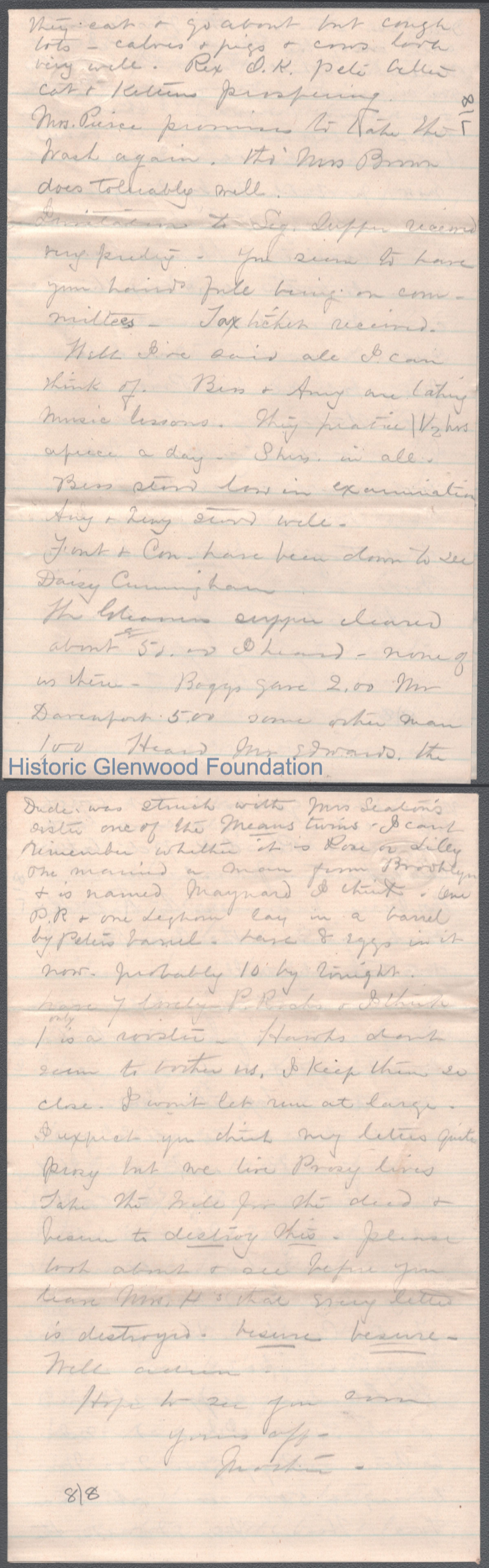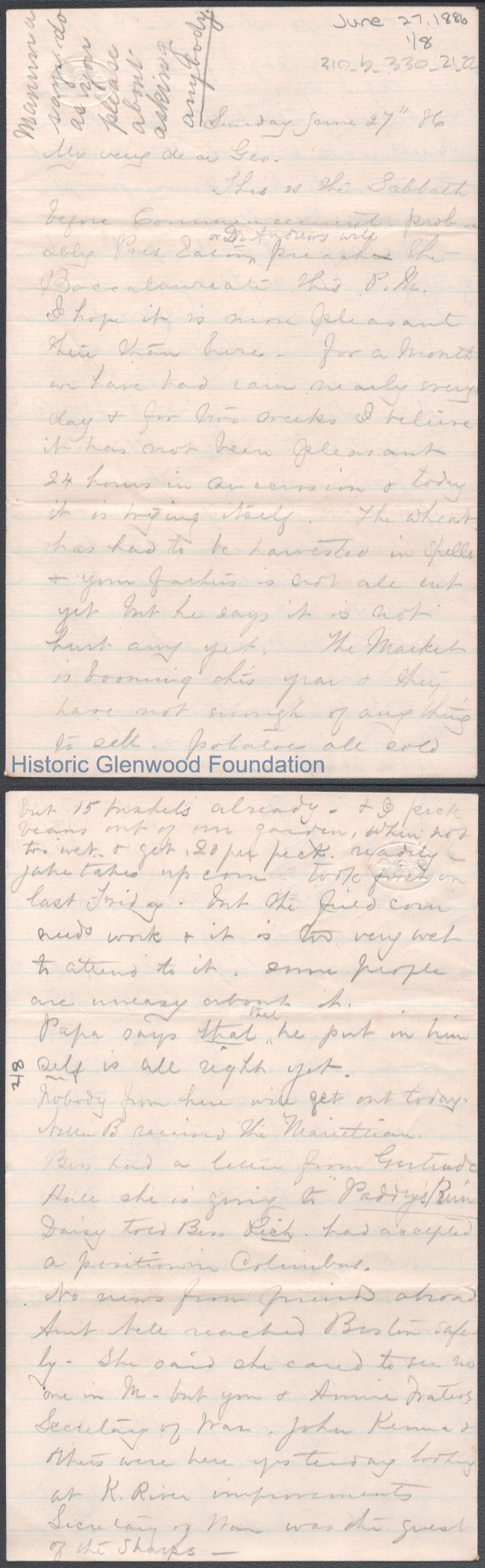 Eight-page letter to George W. Summers from his mother Lucy W. Summers, Jun 27, 1886.