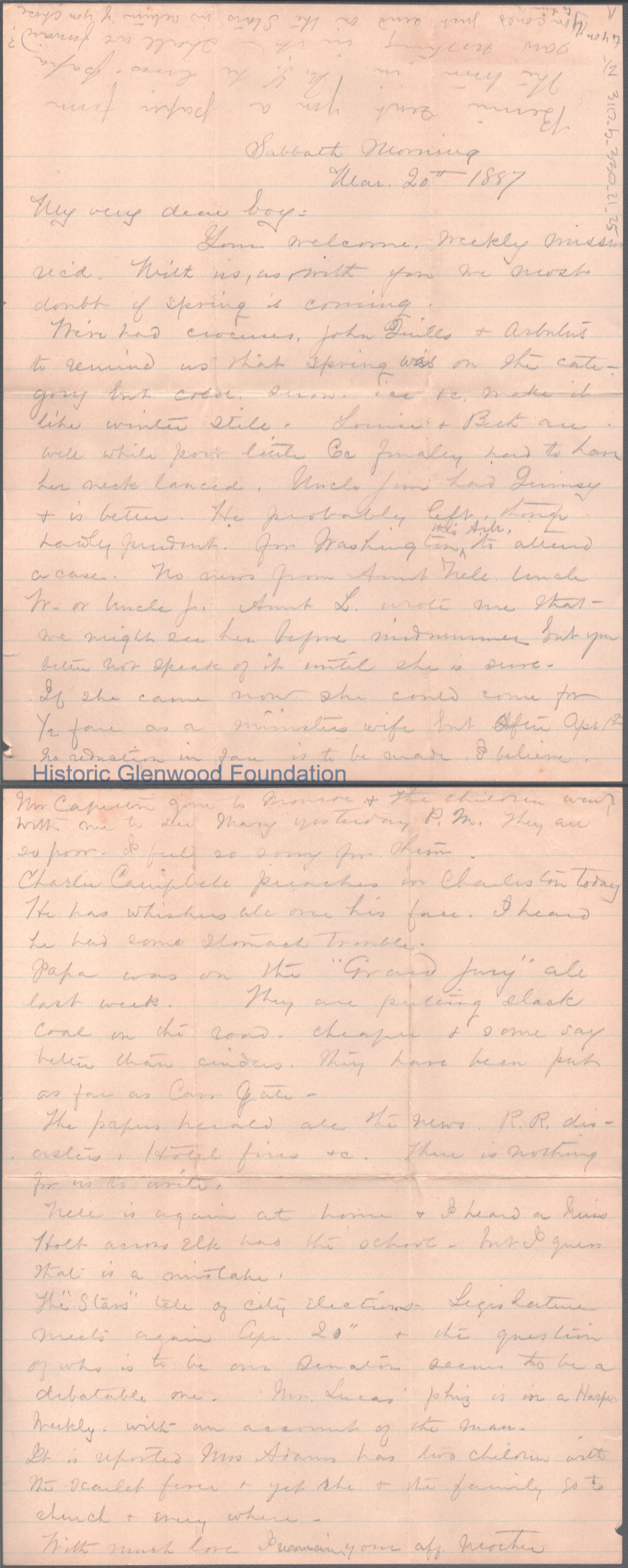 Two-page letter to George W. Summers from his mother Lucy W. Summers, Mar 20, 1887.