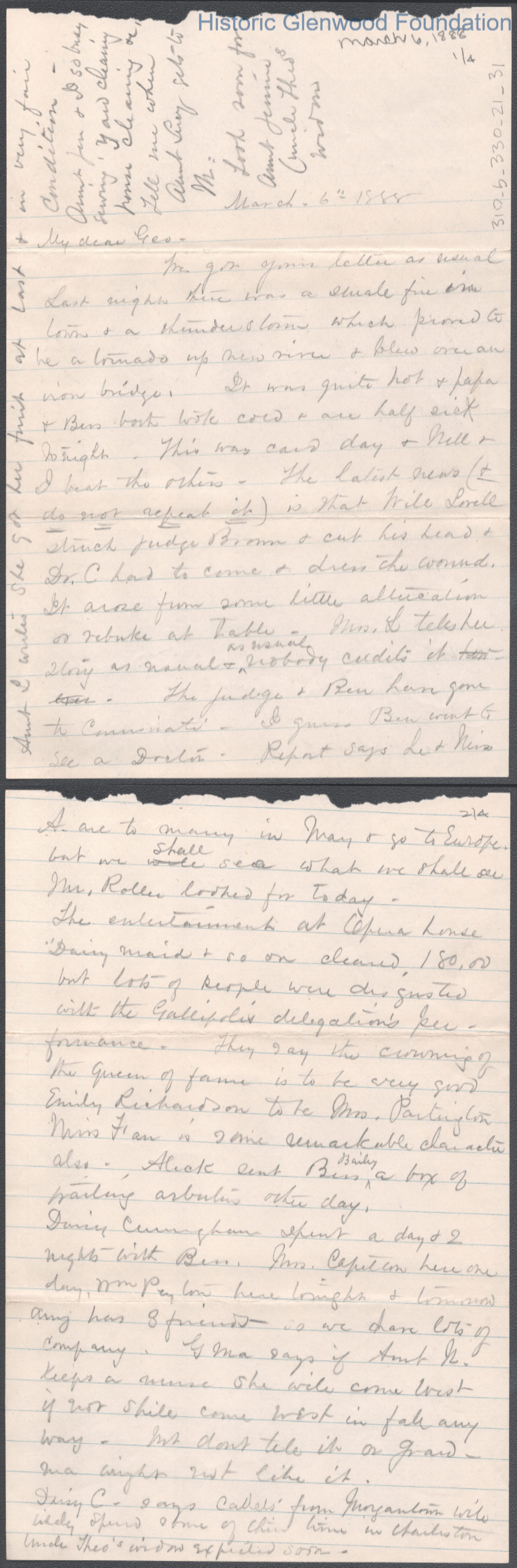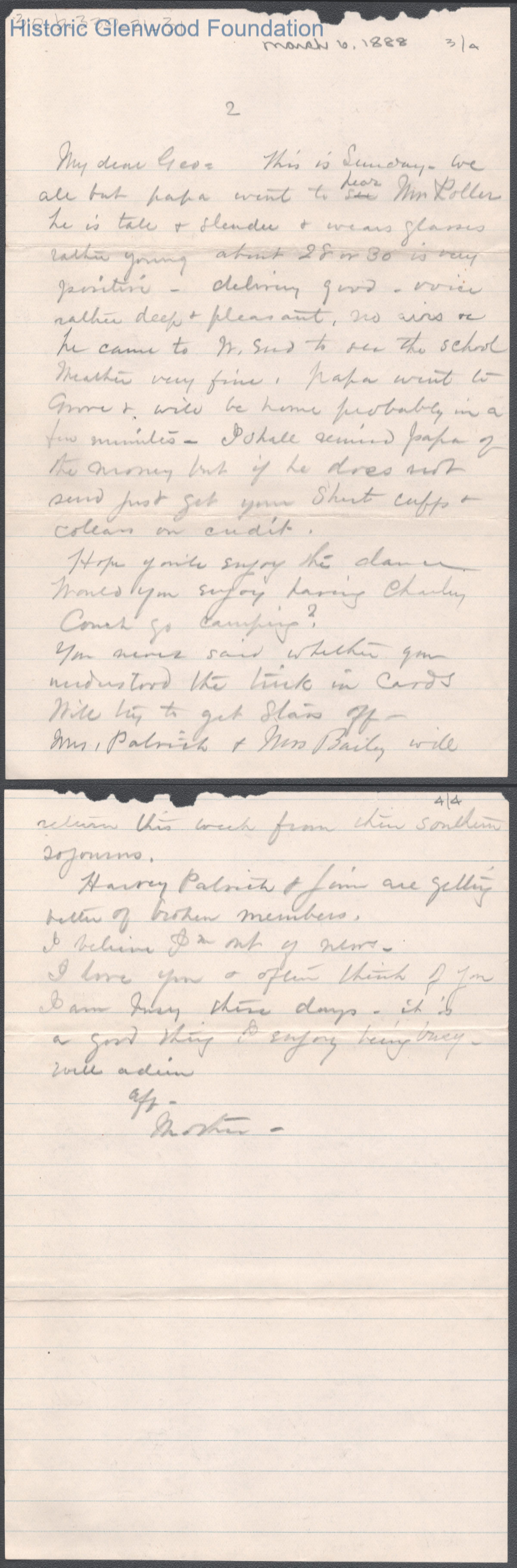 Four-page letter to George W. Summers from his mother Lucy W. Summers, Mar 6, 1888.