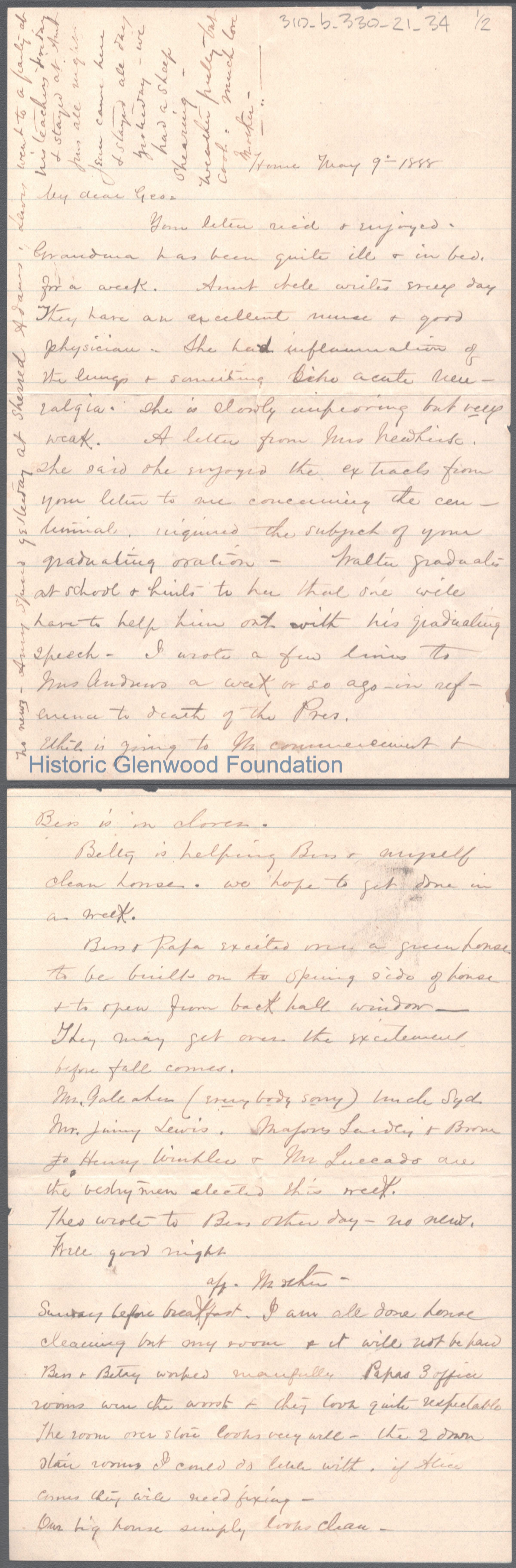 Two-page letter to George W. Summers from his mother Lucy W. Summers, May 9, 1888.