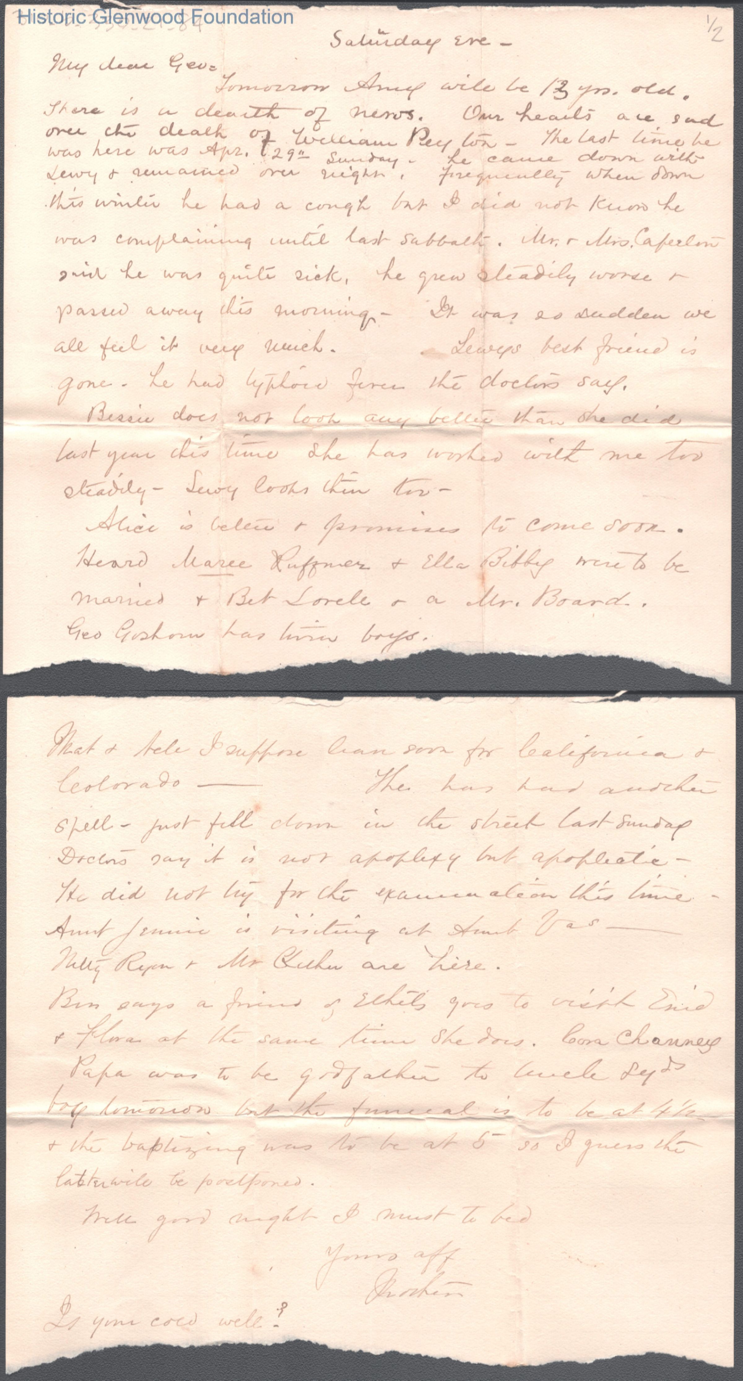 Two-page letter to George W. Summers from his mother Lucy W. Summers, no date.