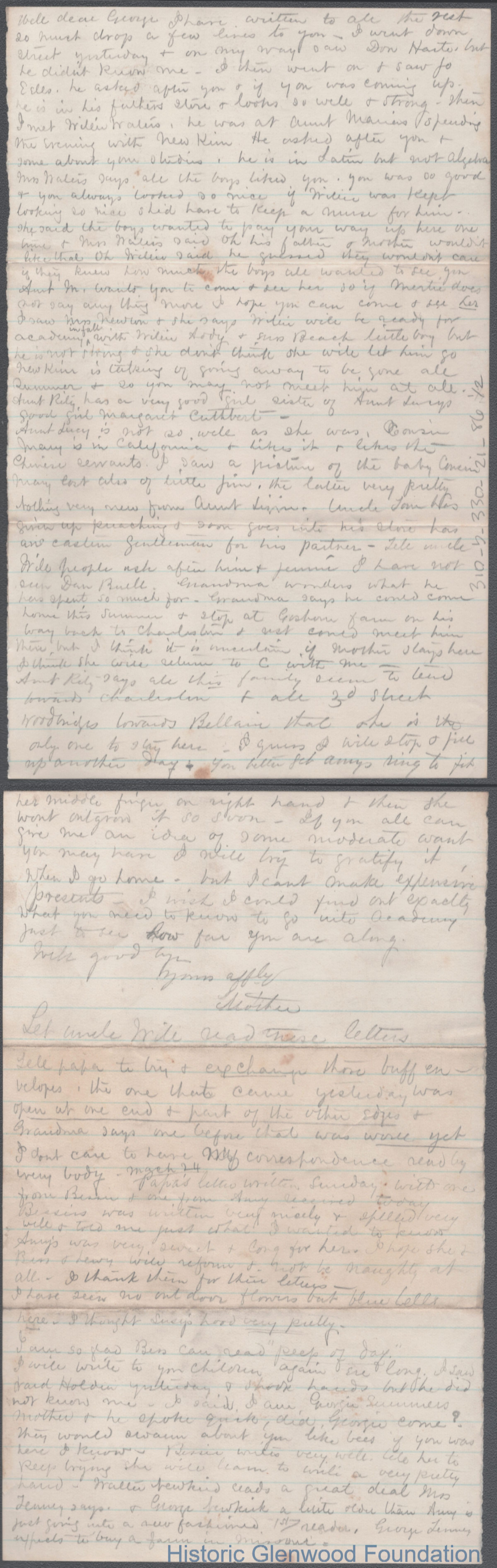 Two-page letter to George W. Summers from his mother Lucy W. Summers, no date.
