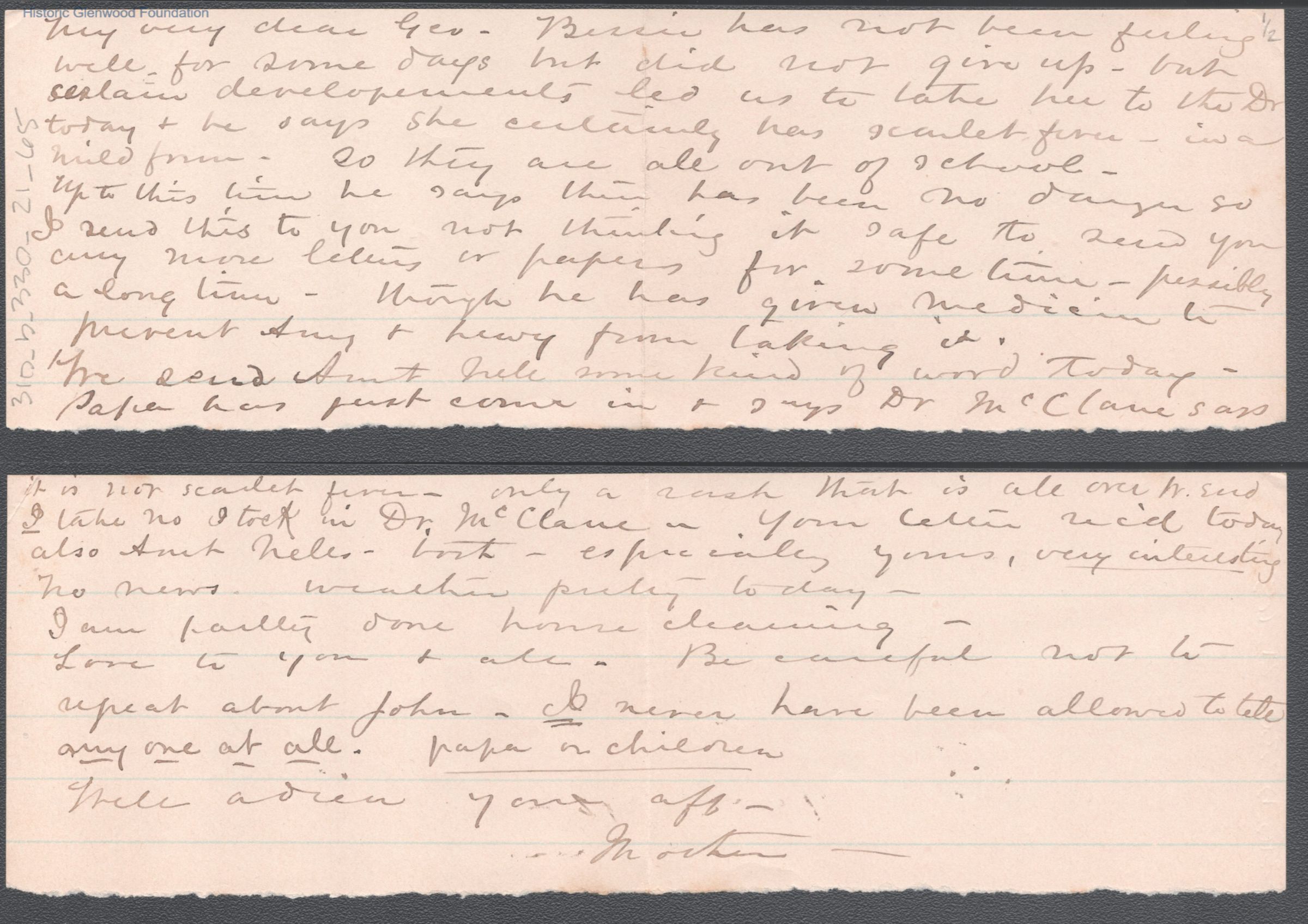 Two-page letter to George W. Summers from his mother Lucy W. Summers, no date.
