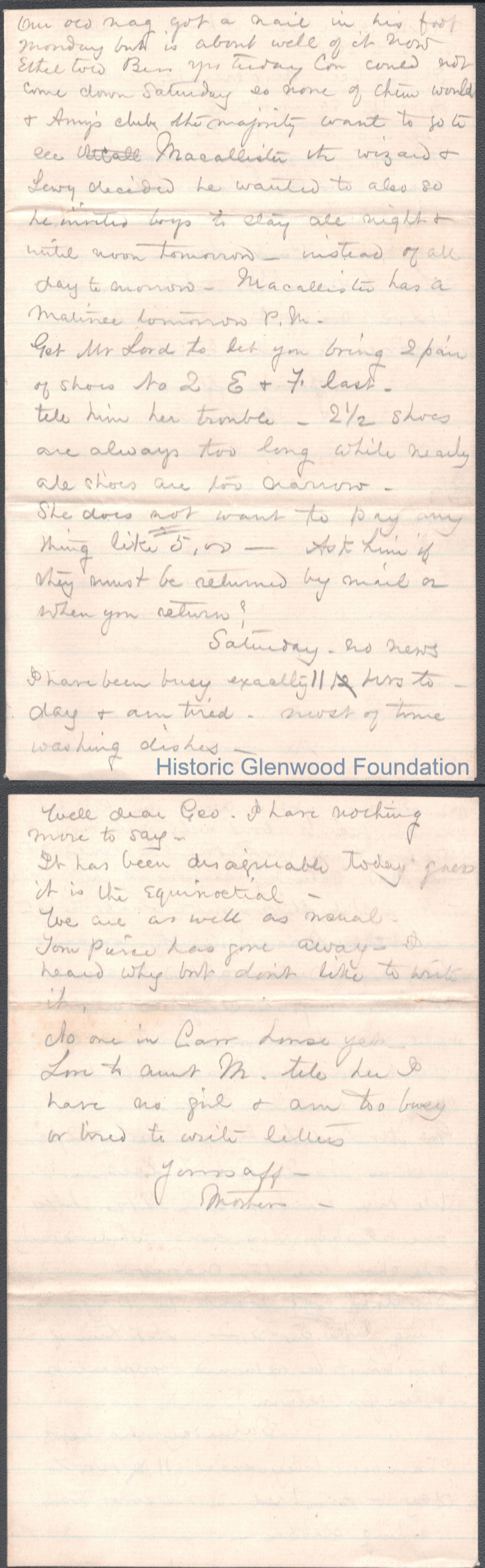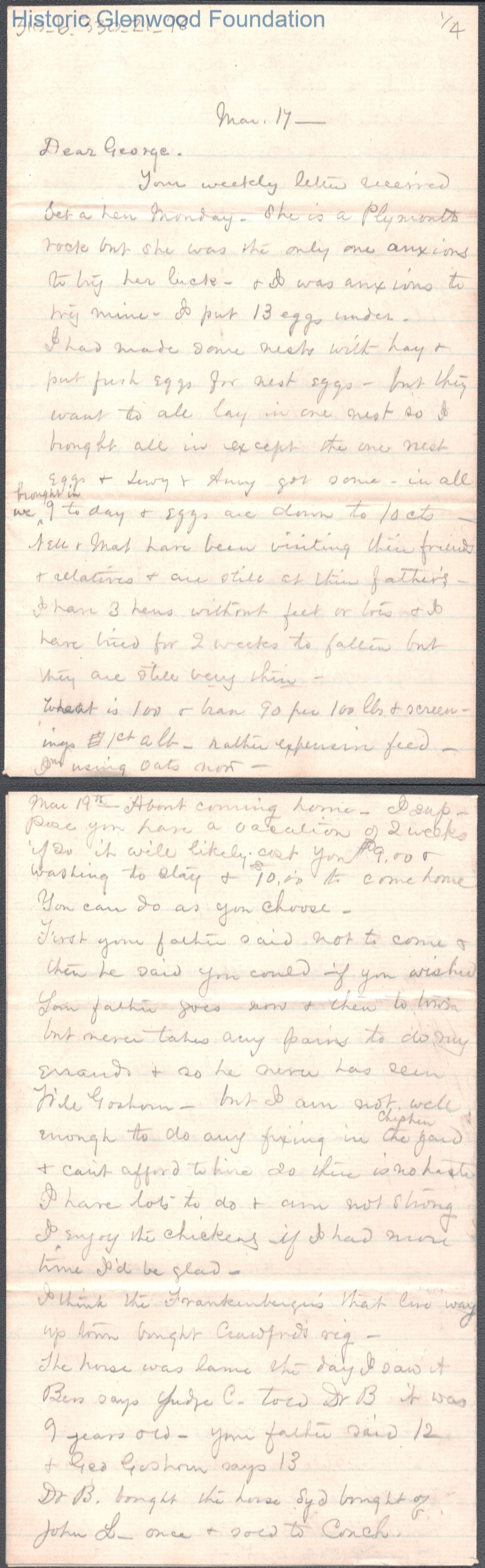 Four-page letter to George W. Summers from his mother Lucy W. Summers. Dated Mar 17, year unknown.